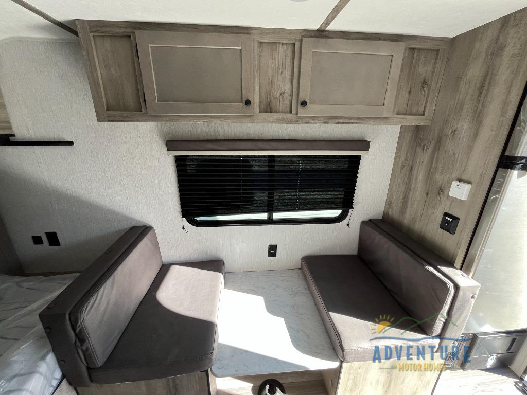 This travel trailer is perfect for couples who want to getaway together! The front bed offers a comfortable place to lay your head at night. When you're not using the booth dinette to enjoy a meal that you prepared with the two burner cooktop or playing a card game, you can transform it into an extra sleeping space. You can start your mornings feeling clean and fresh after showering in the tub with unwanted steam removed with the power roof vent.