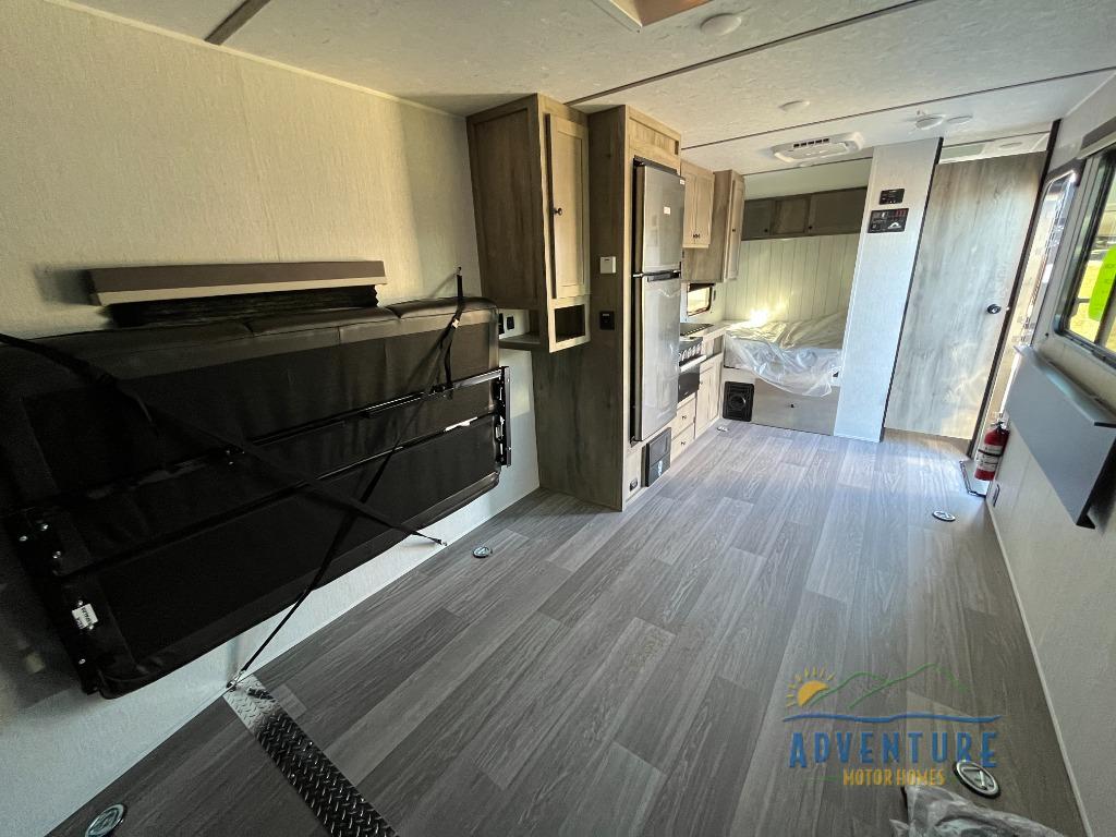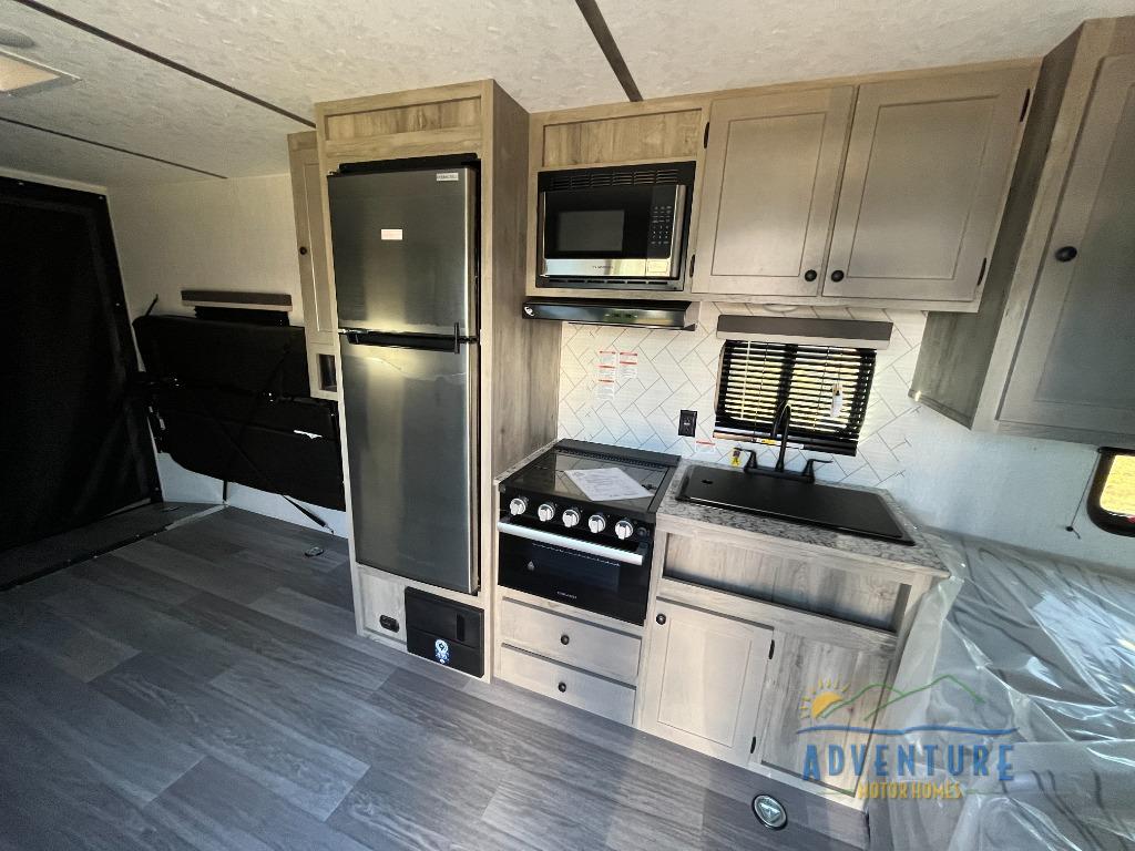 With premium features and a practical design, this toy hauler is the ultimate companion for your next escapade! The 66" sofa invites you to relax and unwind, while the adjacent area is perfect for setting up your gear or enjoying a meal. The refrigerator keeps your snacks and drinks fresh, and the three-burner stove is ready to whip up a hearty meal. Also, the sink and ample counter space make meal prep a breeze, while the nearby storage keeps everything you need within easy reach. The full bathroom is a welcome retreat, featuring a spacious 24 x 32 shower that's perfect for rinsing off after a long day of adventure, and the 60 x 74 bed is a cozy haven, perfect for recharging after a day of exploring. Plus, the generous cargo area is ideal for hauling your toys, gear, and equipment, so you can bring everything you need for the ultimate adventure.