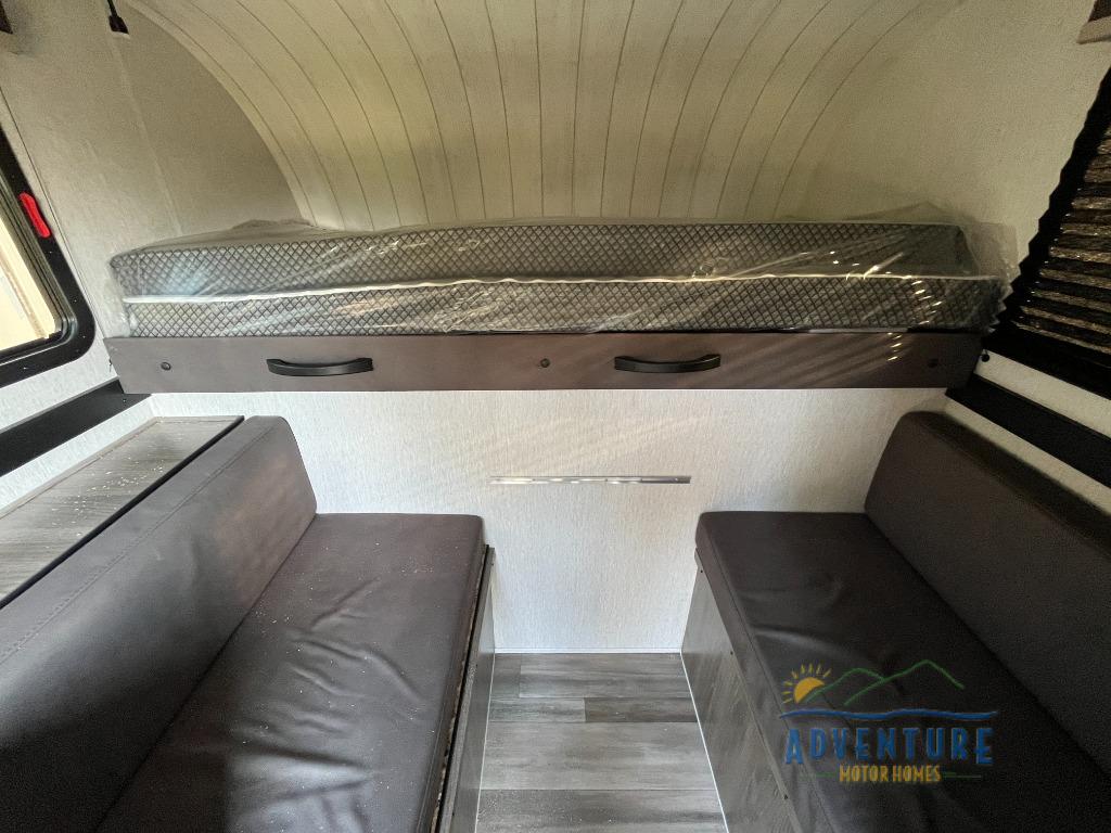 You're sure to find comfort in this truck camper for two! The front bed provides a great night's rest, and there is added seating at the foot of the bed and along the side.This unit also includes counter space, a sink to wash up and a 4.5 12V refrigerator to keep food fresh.