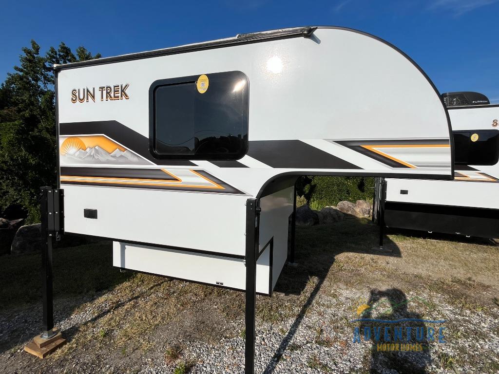 With any Sun Trek truck camper by Sunset Park RV, you will find a durable camper made to last thanks to the vacuum bonded laminated sidewalls and one-piece PVC roof membrane. You will also appreciate your choice of white or gray sidewalls, plus there are manual jacks outside and a 100-watt solar panel for some off-grid power. Inside, a power roof vent will help keep air moving, and you can choose an optional roof A/C if you enjoy camping in the summertime. Additional interior comforts include LED lights, tinted windows and solid surface countertops with a sink cover!