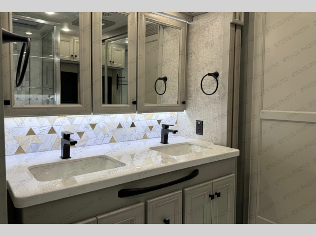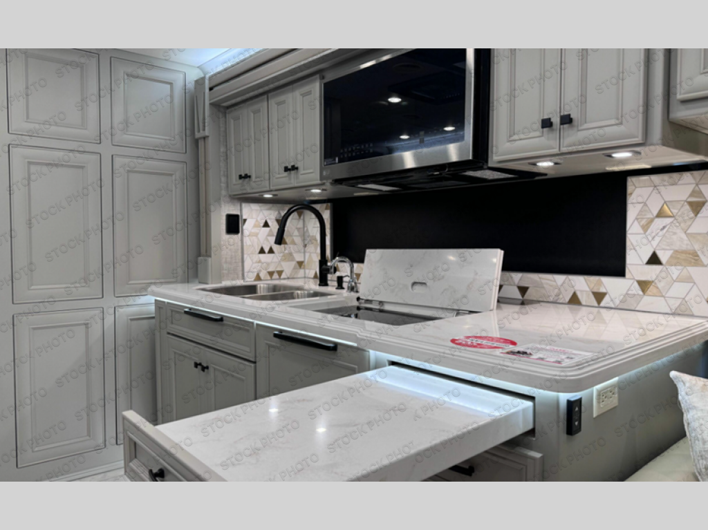 Now you can travel with more friends and family in this coach that includes a bath and a half, and additional sleeping space thanks to the two sofa beds. The master bedroom includes a king bed, 50" TV, plus dual nightstands for your belongings. Dual bath sinks in the full rear bath allow two people to freshen up at once, and a stacked washer and dryer to make wash day a breeze. And check out the kitchen with its residential refrigerator, pantry, stainless steel convection microwave, and drawer-type dishwasher! You will also appreciate the countertop extension for more prep space when it's time for dinner. The dinette with chairs provides a place to dine or get some work done, and one of the sofas includes an ottoman so you can kick your feet up.