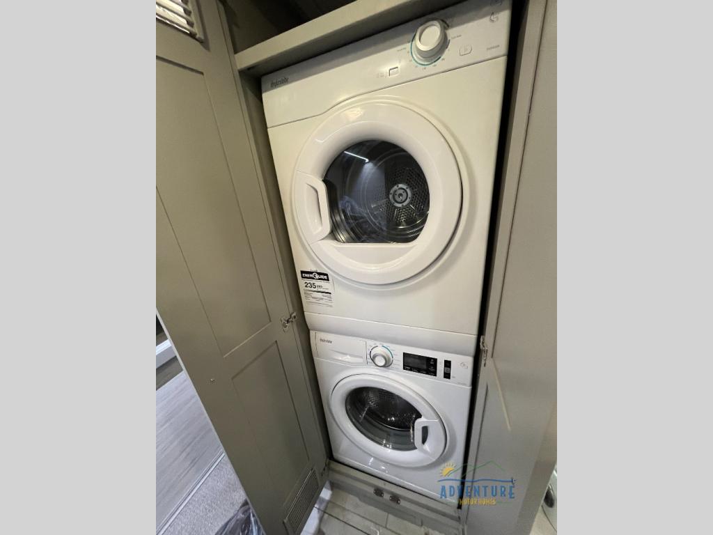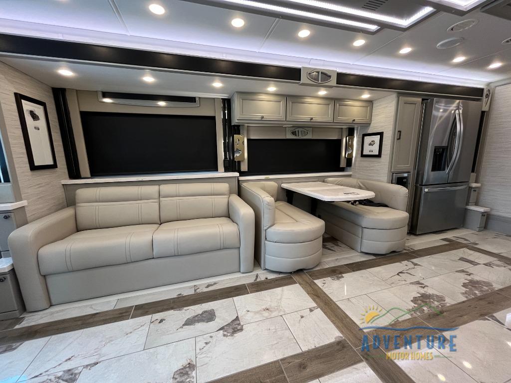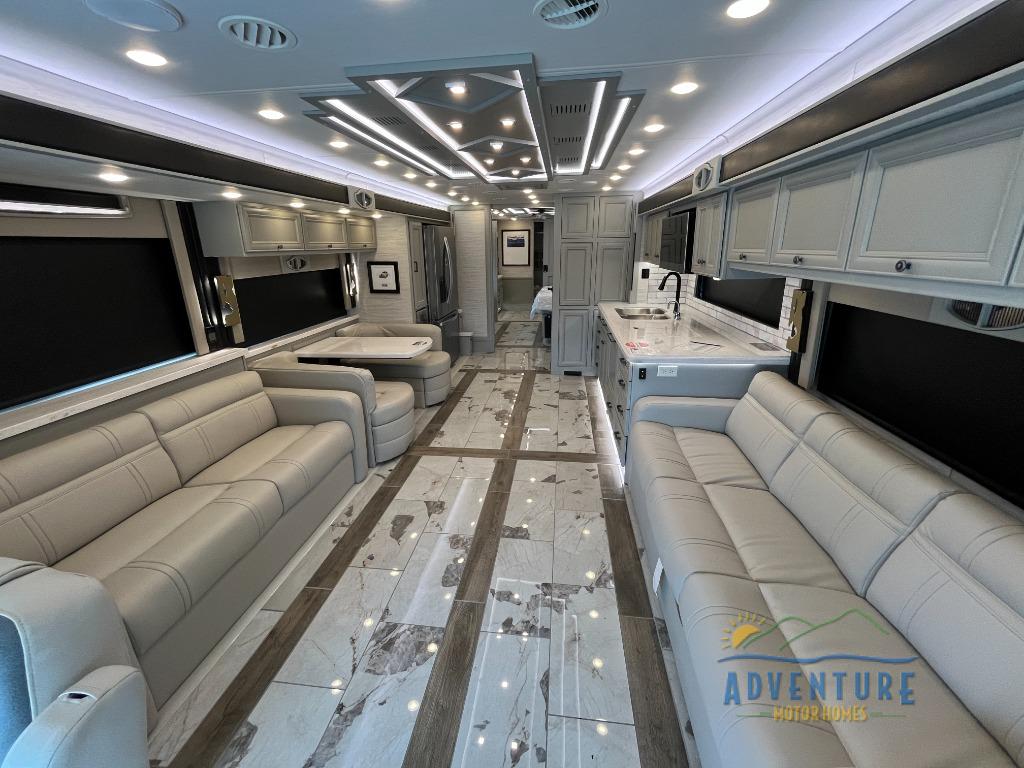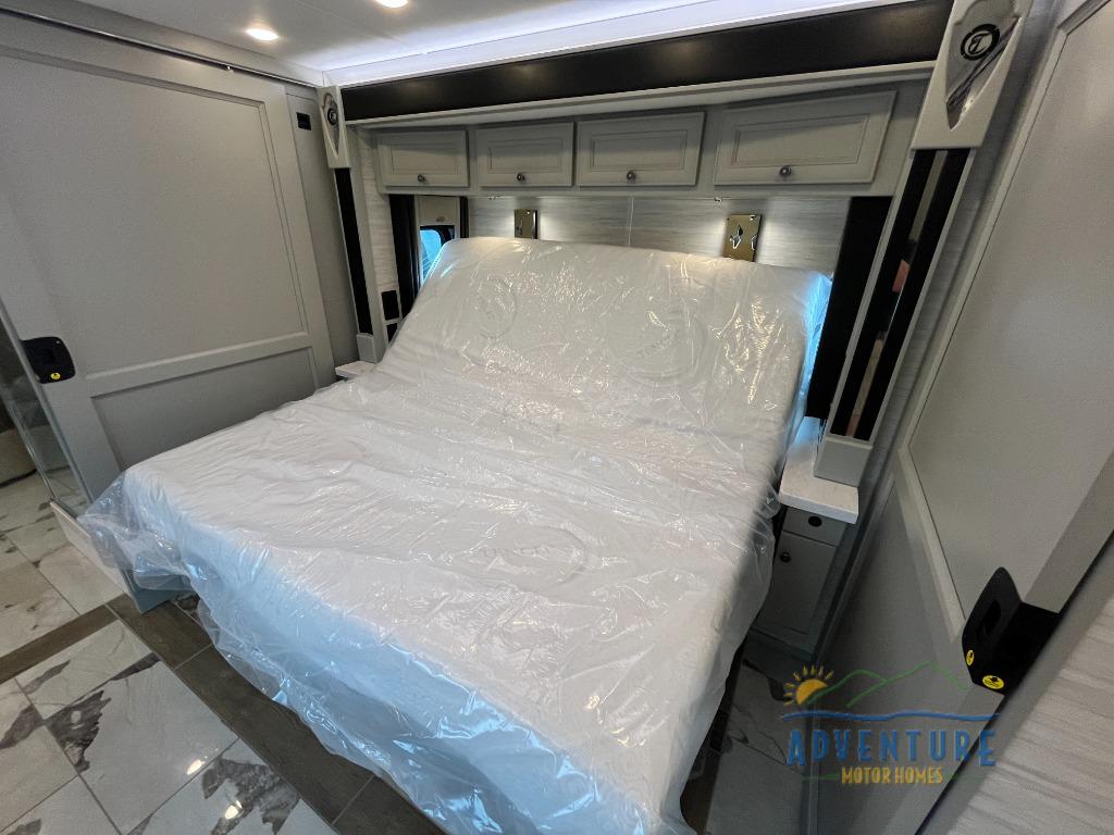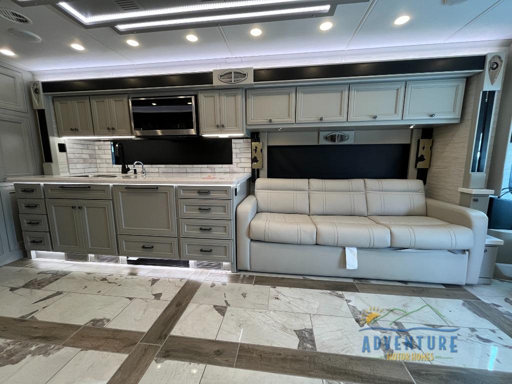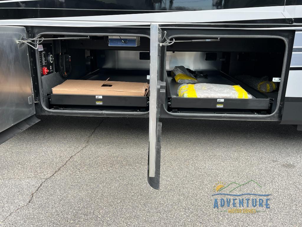 Get ready for luxury trips both near and far in this spacious coach! Once you find somewhere to park for the night, you can cook dinner on the two burner induction cooktop or in the 1.7 cu. ft. Smart convection microwave with an air fryer. There is an Expand-An-Island for more prep space plus pull-out storage and a drawer-type dishwasher to make clean up easier than ever. You can then relax on the DE sofa bed with a lift TV above it or on the air coil sofa bed with an ottoman. There is also a dinette with chairs where you can dine together or get some work done while you're away from home. And the half bath off of the kitchen is convenient for everyone. A master bedroom is sure to meet your needs with a power Smart king bed slide with dual nightstands, a 50" TV, and drawers below an optional fireplace. The feature you might like most on this coach is the full rear bath! Here, you'll find dual bath sinks with a tri-view mirror, a spacious shower, and a floor-to-ceiling closet, complete with storage cabinets, a safe, plus prep for a washer and dryer!