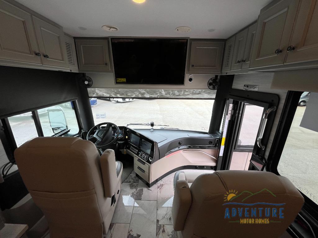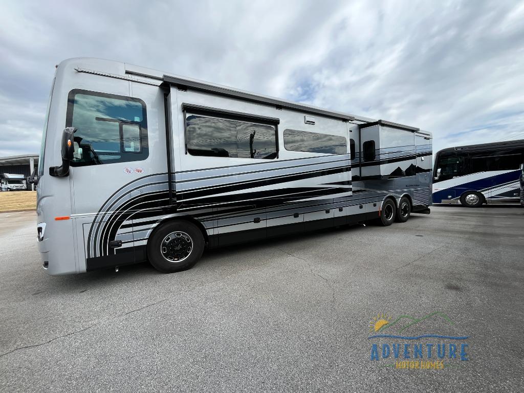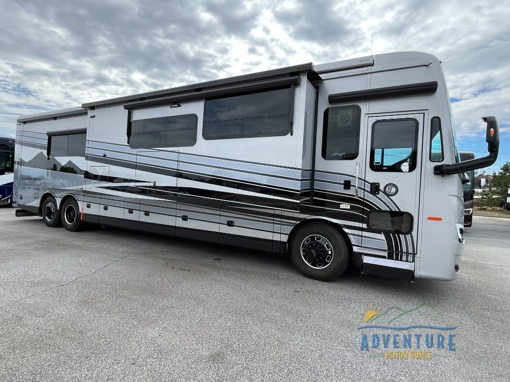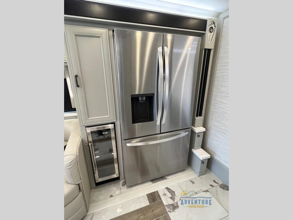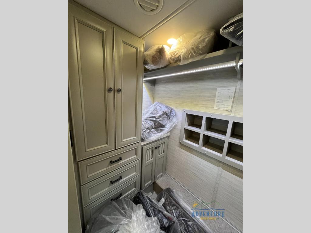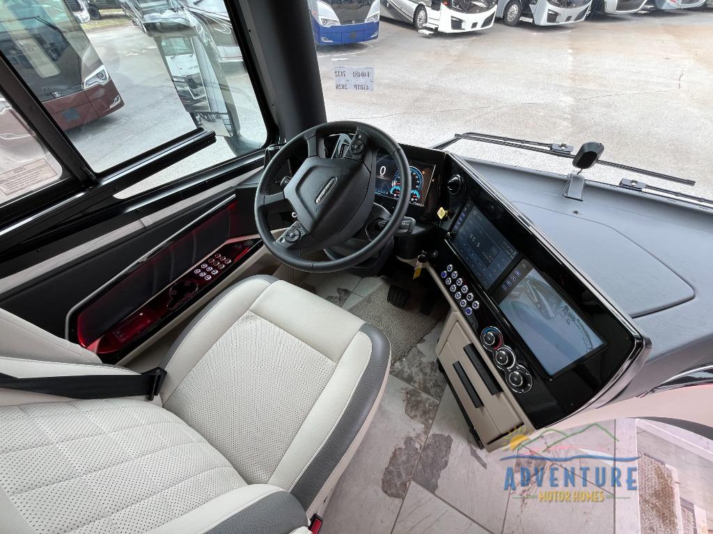 Get ready for luxury trips both near and far in this spacious coach! Once you find somewhere to park for the night, you can cook dinner on the two burner induction cooktop or in the 1.7 cu. ft. Smart convection microwave with an air fryer. There is an Expand-An-Island for more prep space plus pull-out storage and a drawer-type dishwasher to make clean up easier than ever. You can then relax on the DE sofa bed with a lift TV above it or on the air coil sofa bed with an ottoman. There is also a dinette with chairs where you can dine together or get some work done while you're away from home. And the half bath off of the kitchen is convenient for everyone. A master bedroom is sure to meet your needs with a power Smart king bed slide with dual nightstands, a 50" TV, and drawers below an optional fireplace. The feature you might like most on this coach is the full rear bath! Here, you'll find dual bath sinks with a tri-view mirror, a spacious shower, and a floor-to-ceiling closet, complete with storage cabinets, a safe, plus prep for a washer and dryer!