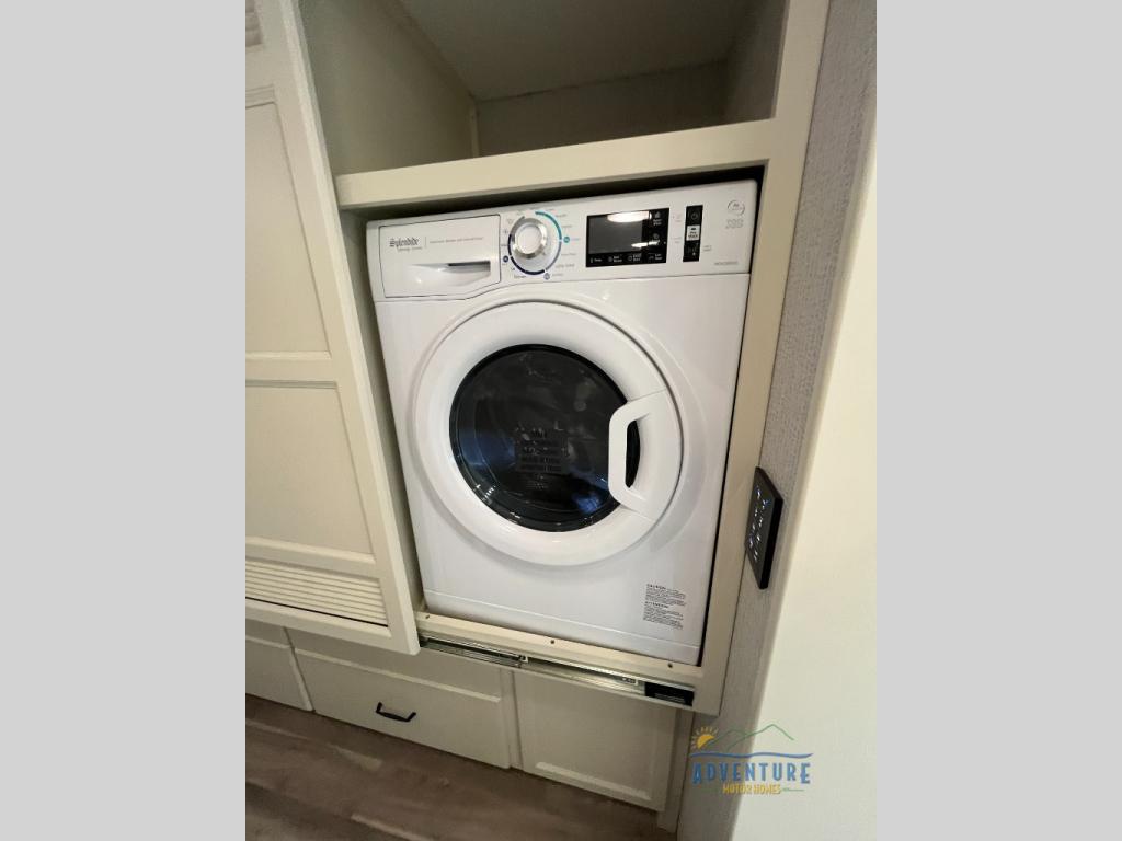 You will feel right at home in this motorhome! It features a rear private bedroom with a king bed slide that has an egress window behind it, a wardrobe with drawers, and an optional combo washer/dryer. Just outside the bedroom is the split-style bath where one person can freshen up in the shower while another uses the private toilet and sink. After you have prepared a delicious meal with the three burner liquid propane cooktop, you can enjoy it at the booth dinette-sleeper. The dinette can become your guests' sleeping space at night, along with the flip and fold sofa bed or the optional drop-down front bunk! You can also choose the optional theater seating if you don't need the additional sleeping space. This model also includes a living area TV with an optional fireplace below, a 20 cu. ft. stainless steel residential refrigerator with a top freezer, and many more interior comforts!