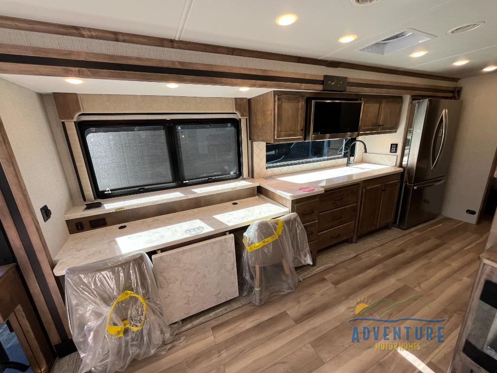 There are many standard luxurious features you will love about this motorhome! It also has many optional features you can add like the optional drop-down front bunk, the optional super sofa and the optional theater seating. The queen bed slide in the rear private bedroom offers a comfortable place to sleep, as well as the flip and fold sofa bed in the living area. You will love the dinette bar with a lift TV, a flip-up countertop, and two chairs that will make this the perfect place to get some work done while you're on the road. The kitchen includes everything you need to prepare meals each day, including a 1.7 cu. ft. smart convection microwave with an air fryer, a three burner liquid propane cooktop, and a 23 cu. ft. stainless steel residential refrigerator with French doors and a bottom freezer. Head to the rear master bedroom with a queen bed slide out, a large wardrobe, a cabinet with a TV and drawers below, plus a private entrance into the dual entry bath!