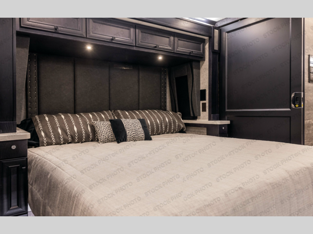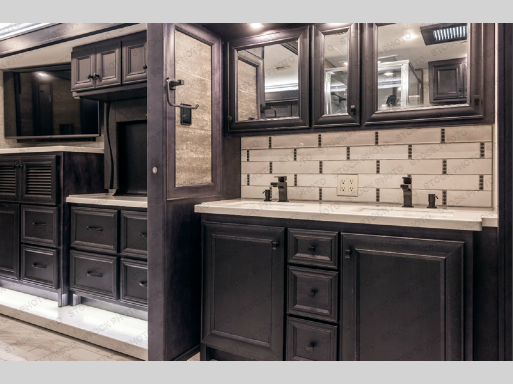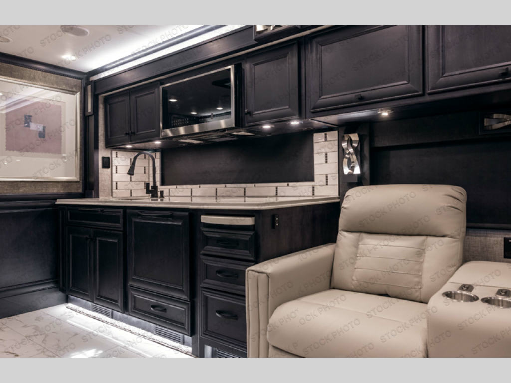 You will feel right at home in this coach with a master suite and king bed slide, mounted TV, laundry hamper, and stacked drawers. You all have quick access to the full rear bathroom. The bathroom not only has a dual sink vanity with a tri-view mirror for two to get ready at once, but also a shower with a seat and a large closet with an area next to it prepped to add an optional washer and dryer. The chef can prepare their best meals either indoors with the countertop extension and cooktop with convection microwave or outside if you add the optional outdoor grill. You can even watch the big game outside with the exterior TV with a sound bar!