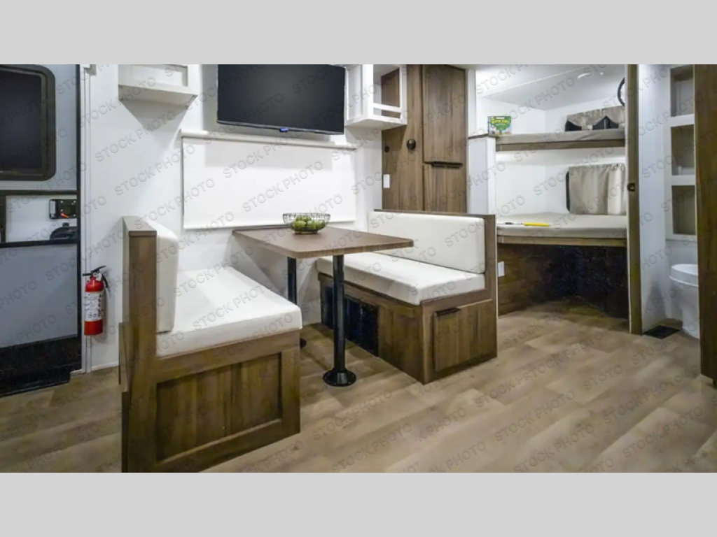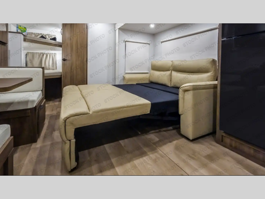 Weekend trips to the campground are made easy in this spacious travel trailer for eight! There is a front private bedroom with a space saving sliding door, a 66" x 80" Olympic queen bed, and dual wardrobes to keep your things tidy. The bunks in the back will provide compact sleeping space for guests, and there is a tri-fold sofa slide out and a booth dinette in the combined kitchen and living area for even more accommodations. A storage cabinet is found beside the booth dinette to keep snacks stocked, and a TV will let you enjoy movie nights! The chef of your group is sure to appreciate the flip-up counter for more prep space, along with all the appliances needed to create their best meals.