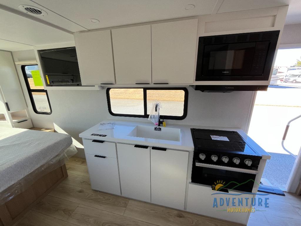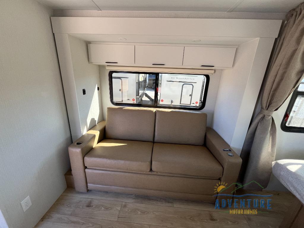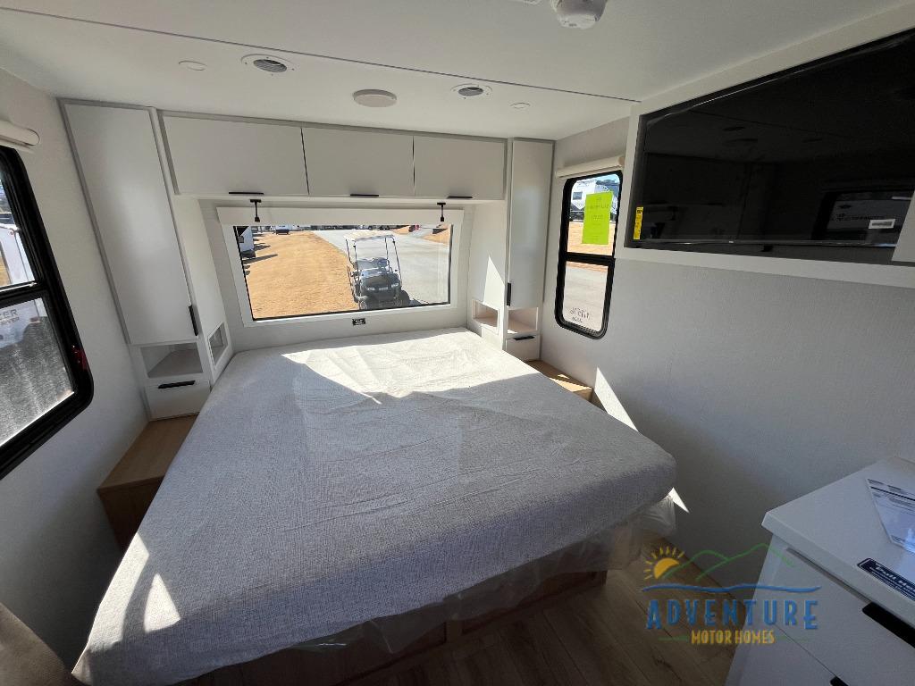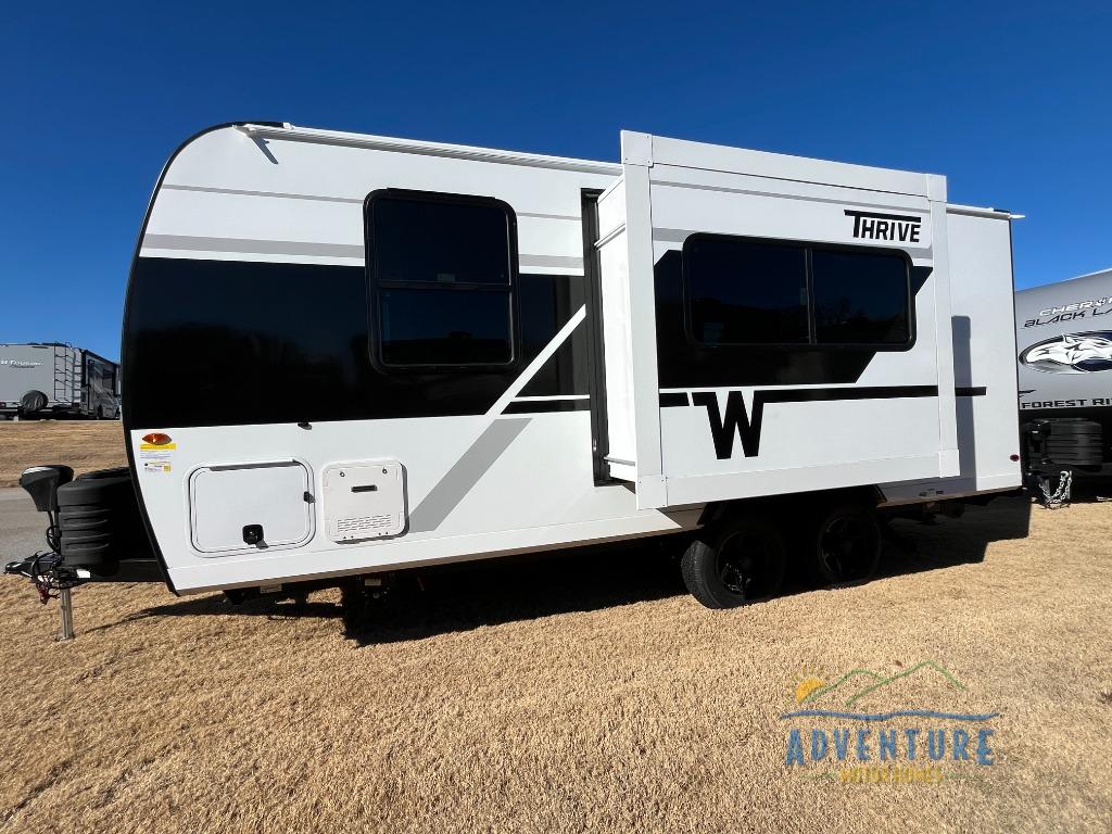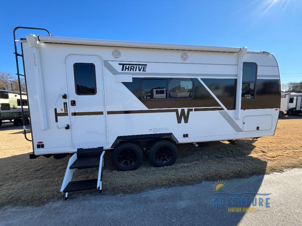 With any Thrive travel trailer by Winnebago, you can camp with functionality, comfort, and convenience! The large front viewing window will be the first thing that catches your eye, and the fiberglass sidewalls with Azdel Onboard provide a durable trailer made to last. There is also an exterior ladder, along with front radius profile lights, power stabilizer jacks, and a powered awning with LED lighting to name a few exterior features. You will stay powered up by the 30-amp power cord and 200-watt solar panel, plus there is a tankless water heater for endless hot showers. Inside, you'll love the custom Winnebago furniture, carpetless side outs, molded fiberglass countertops, and residential recessed ceiling lights to keep your space well lit!