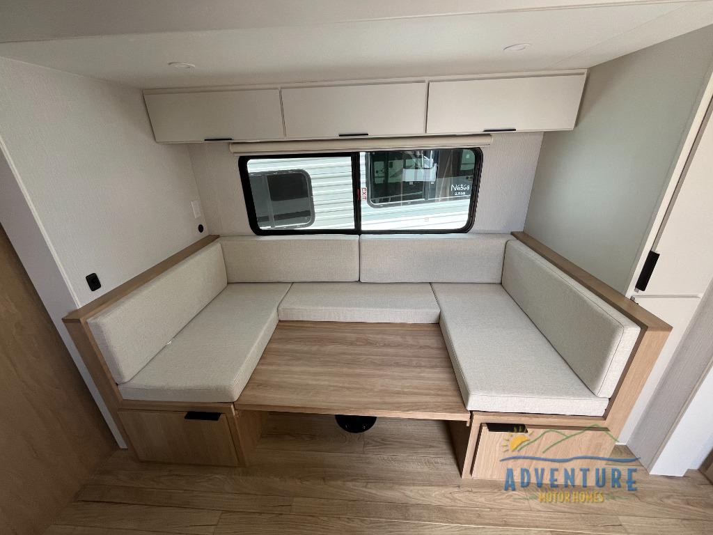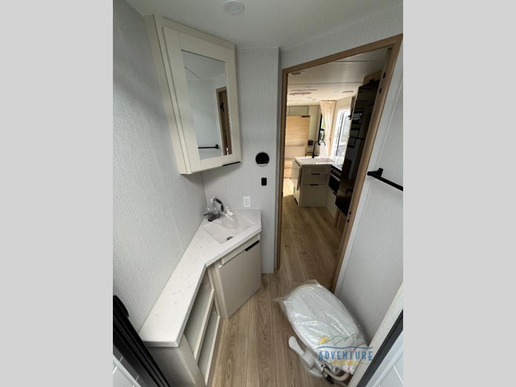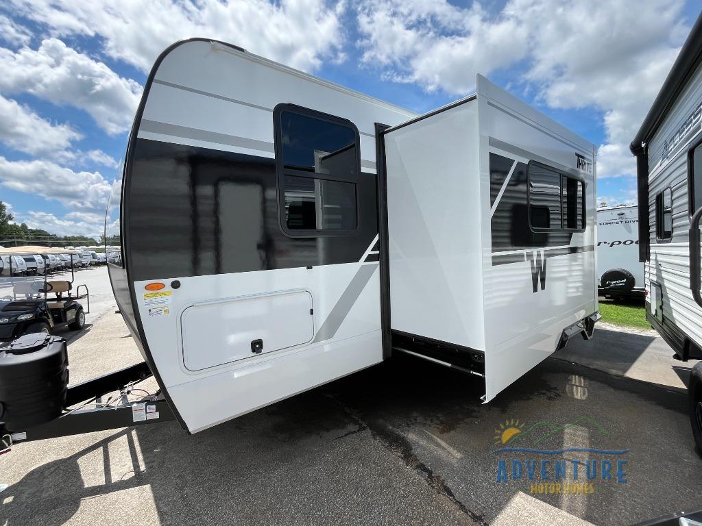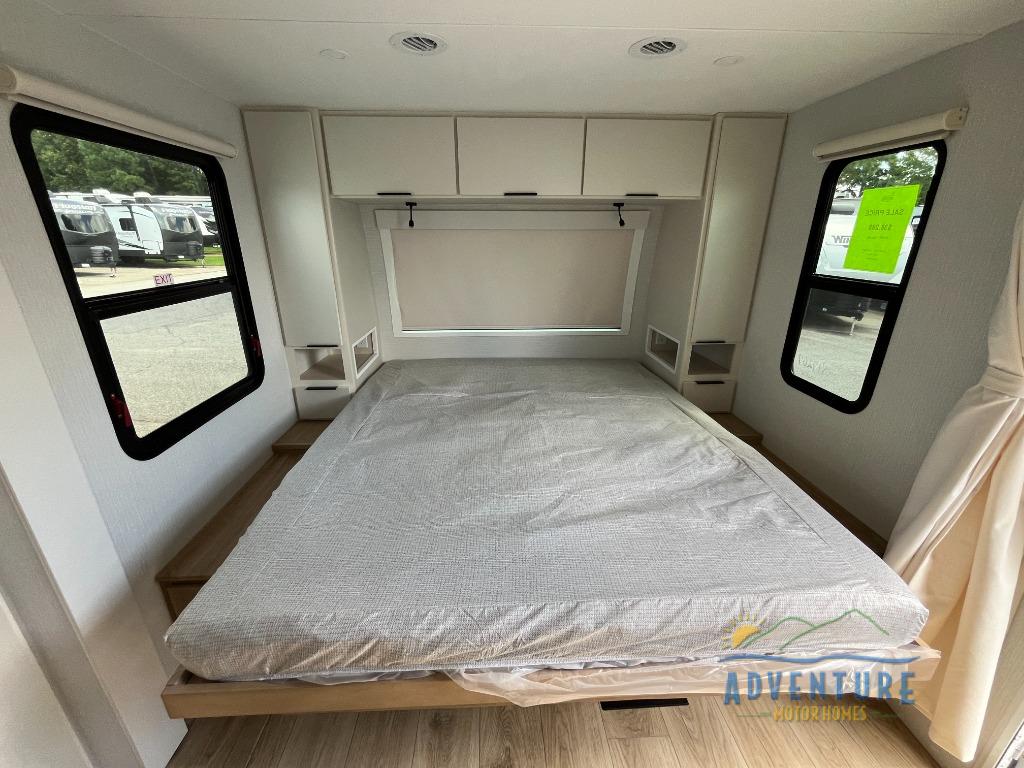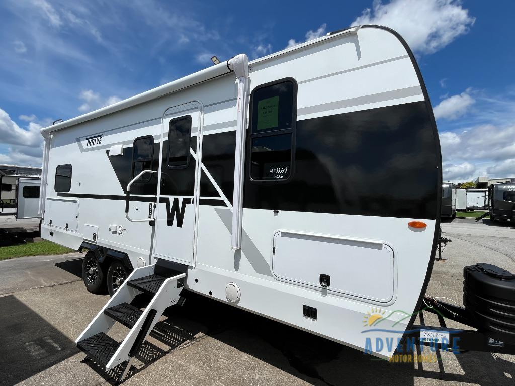 With any Thrive travel trailer by Winnebago, you can camp with functionality, comfort, and convenience! The tinted and frameless front window will be the first thing that catches your eye, and the fiberglass sidewalls with Azdel Onboard provide a durable trailer made to last. There is also an exterior ladder, along with front radius profile lights, power stabilizer jacks, and a powered awning with LED lighting to name a few exterior features. You will stay powered up by the 30-amp power cord and 200-watt solar panel, plus there is a tankless water heater for endless hot showers. Inside, you'll love the custom Winnebago furniture, carpetless side outs, molded fiberglass countertops, and residential recessed ceiling lights to keep your space well lit!