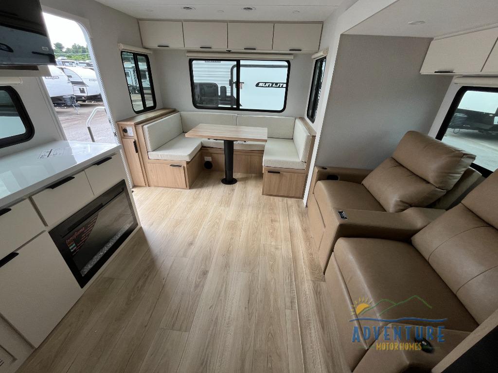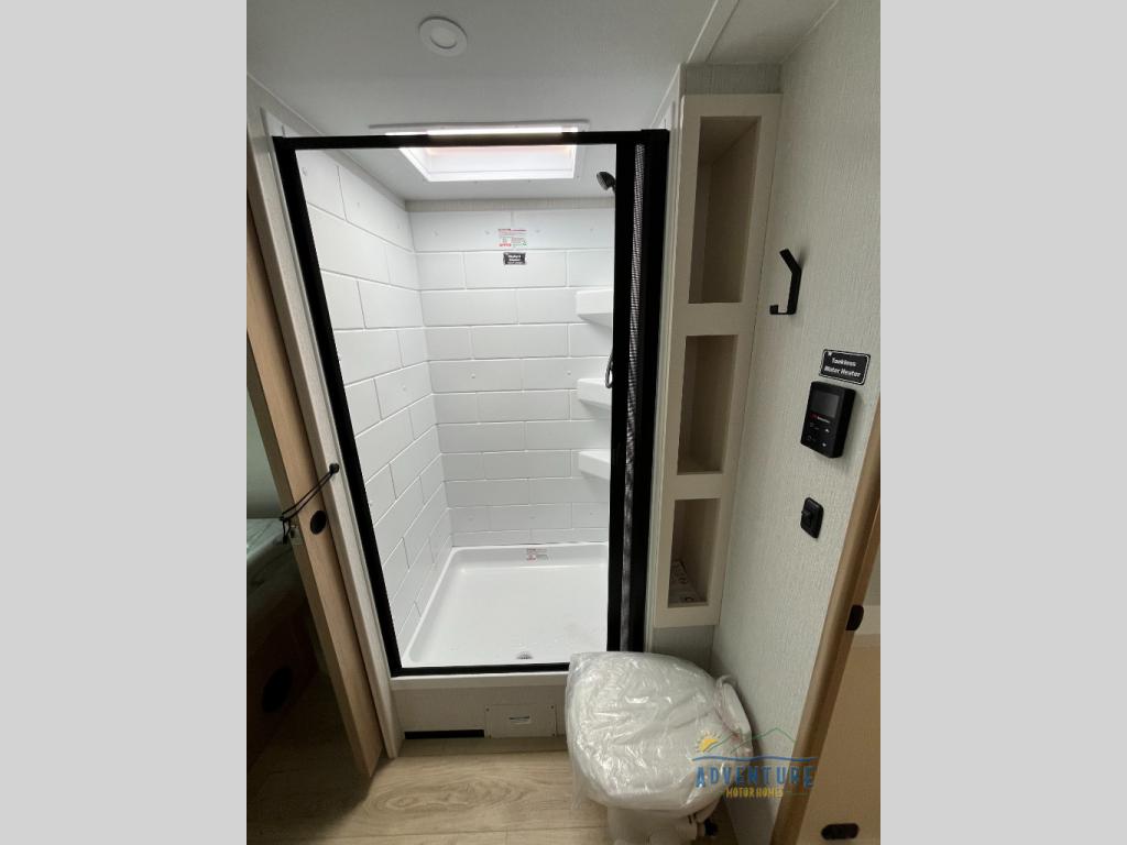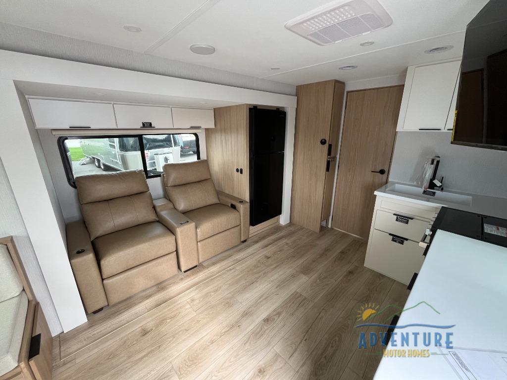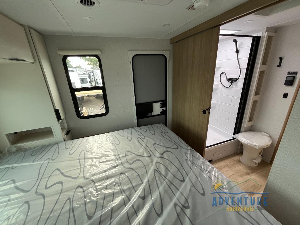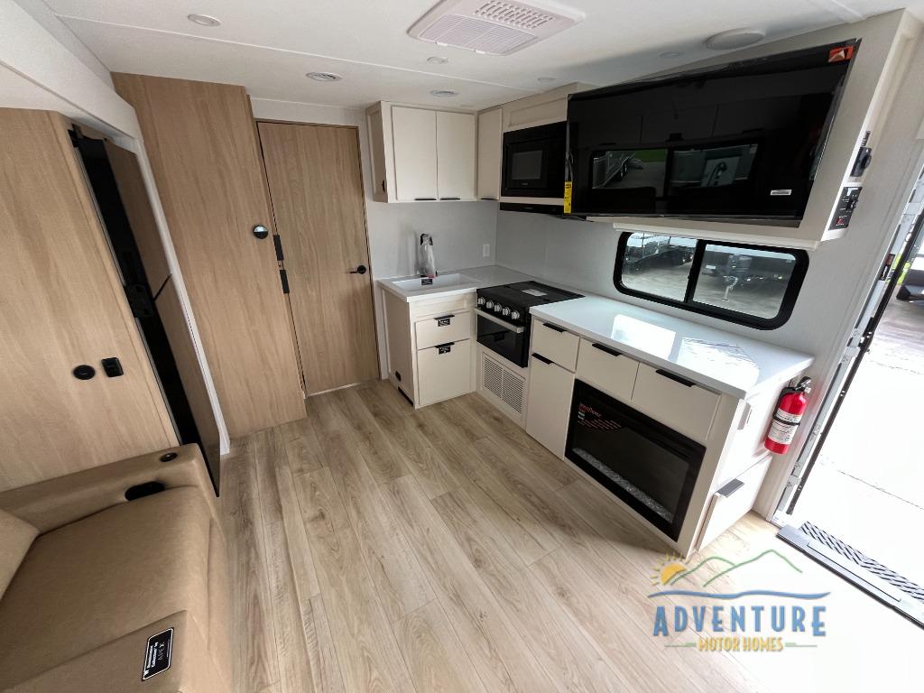 The rear living space of this travel trailer offers a spacious and welcoming layout, perfect for relaxing or entertaining after a day of adventure. In the main area three is a large 42" x 86" U-shaped dinette, with plenty of room for meals, games or gathering to share stories. Beside there is theater seating located in the slide-out that adds extra comfort and seating space. Across, a cozy fireplace and TV making this the ideal spot for winding down in the evenings. The kitchen and appliances allow the chef to easily move around in the spacious living area. Moving forward, a pass-through bathroom adds convenience and privacy, leading to the front private bedroom. Here you'll find a spacious 66" x 80" Olympic Queen Bed, on each side wardrobes for ample storage. The bedroom also features a second exterior entry door, providing easy access without disturbing the main living area.
