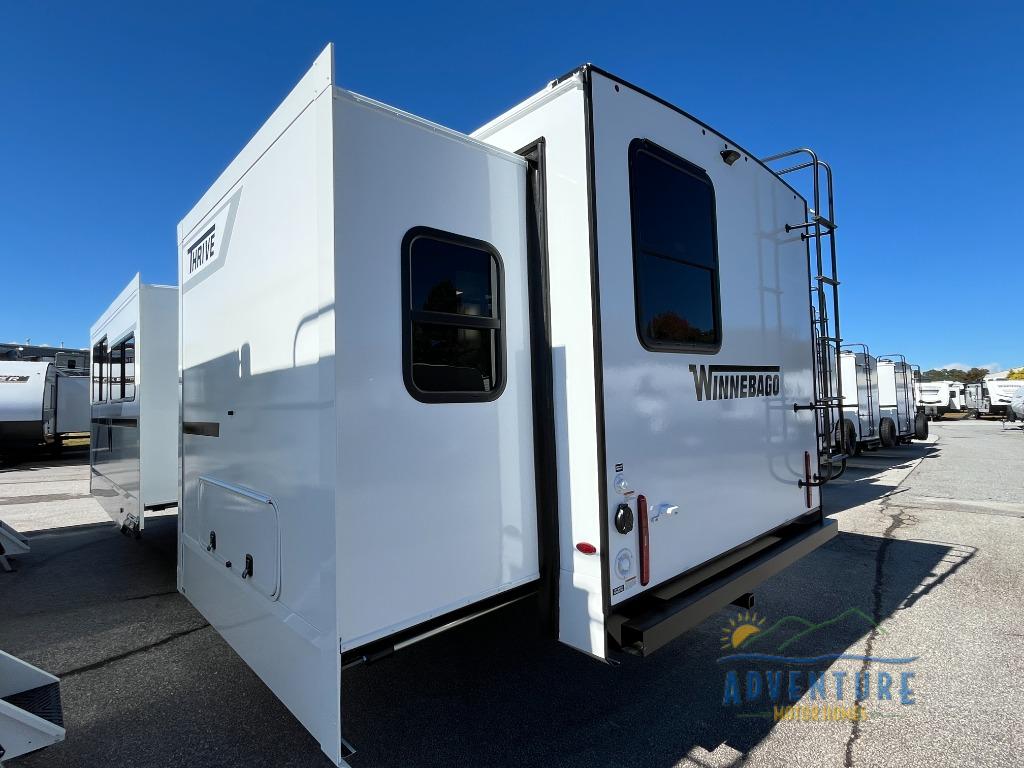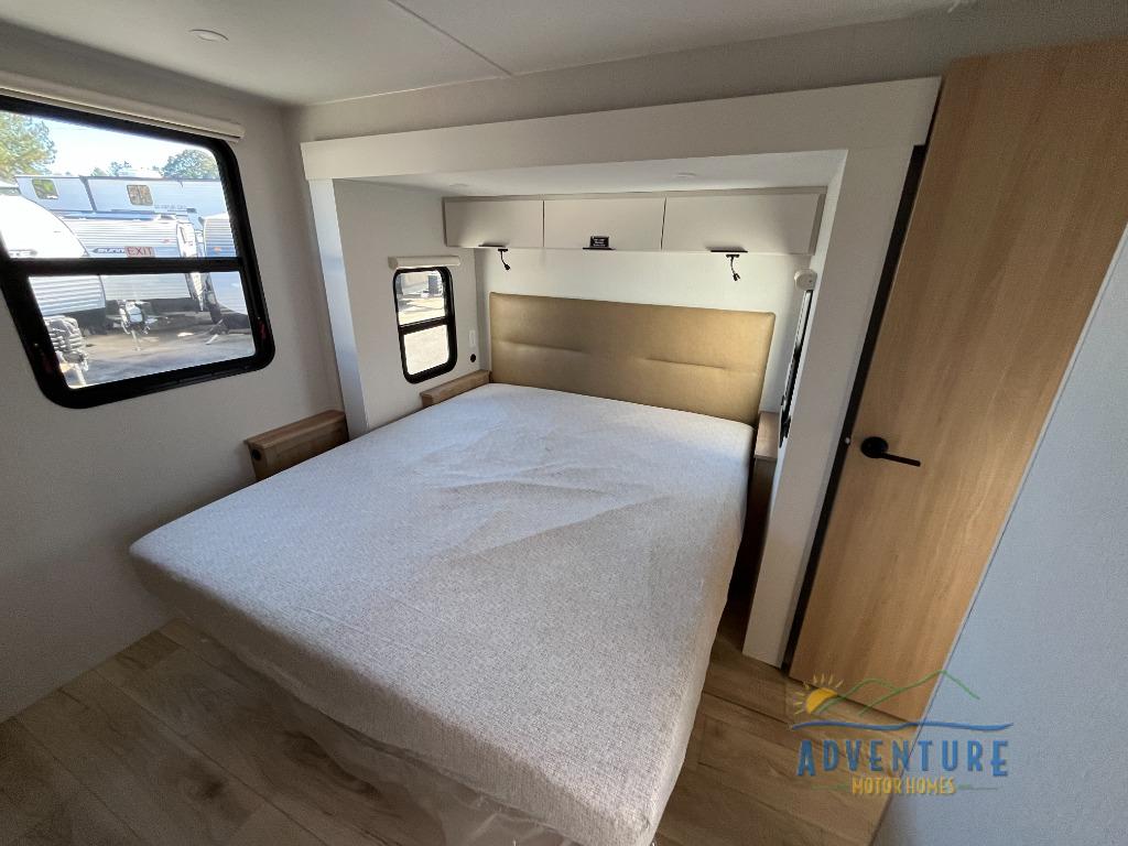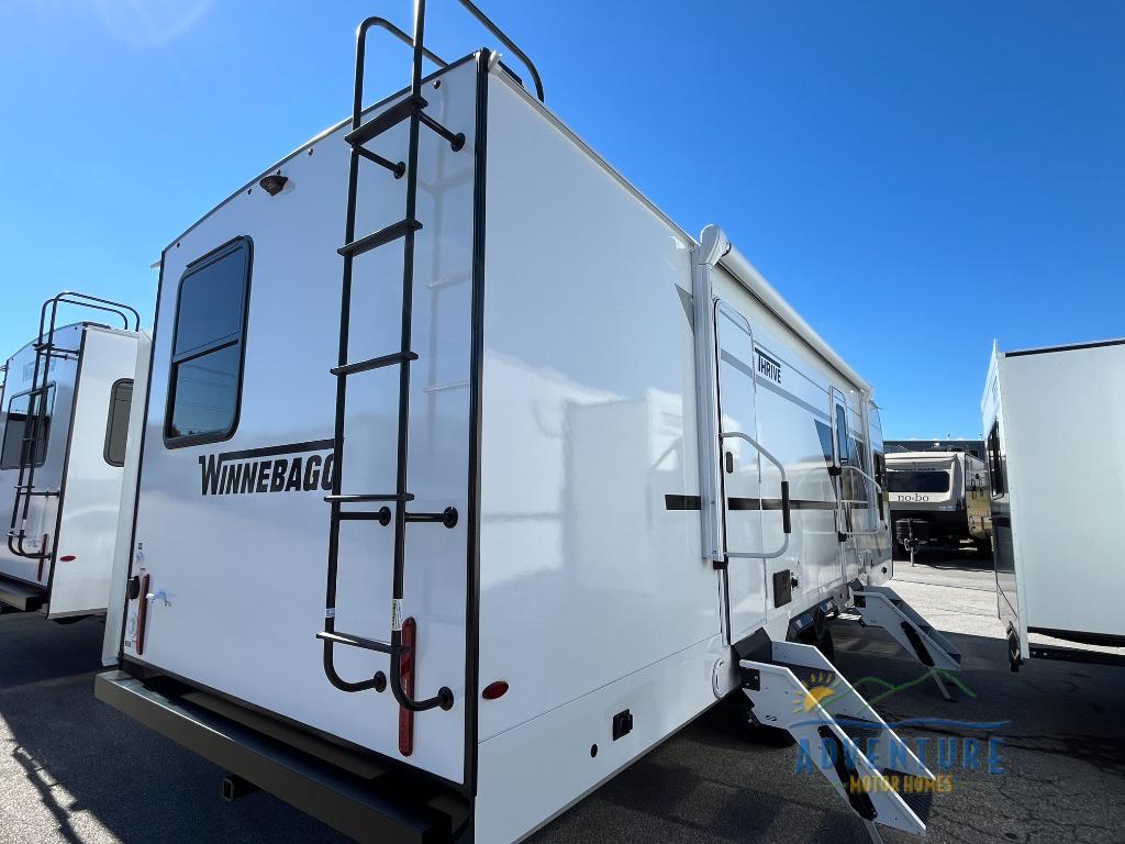 With any Thrive travel trailer by Winnebago, you can camp with functionality, comfort, and convenience! The large front viewing window with strike guard will be the first thing that catches your eye, and the fiberglass sidewalls with Azdel Onboard provide a durable trailer made to last. There is also an exterior ladder, along with front radius profile lights, power stabilizer jacks, and a powered awning with LED lighting to name a few exterior features. You will stay powered up by the 30-amp power cord and 200-watt solar panel, plus there is a tankless water heater for endless hot showers. Inside, you'll love the custom Winnebago furniture, carpetless side outs, molded fiberglass countertops, and residential recessed ceiling lights to keep your space well lit!