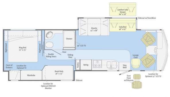 Sunova Class A w/Double Slideouts, Rear King Bed w/Nightstands, Chest of Drawers/Wardrobe/Bunk Bed Slide, Bath w/Shower, Toilet & Vanity w/Sink, Dbl. Sliding Doors Between Bedroom & Bath, Booth Dinette & Sofa Bed Slide, Lounge Chair, Dbl. Kitchen Sink, 3 Burner Range, Refrig., Pantry & Much More! Available Options May Include: TV in Bedroom, DVD/LCD Monitor Above Bunks, Comfort Sofa Sleeper IPO Sofa Bed, Euro Chair w/Ottoman IPO Lounge Chair, 32" LCD TV Above Cab, 22.5" Tires (add 2" ext. ht).