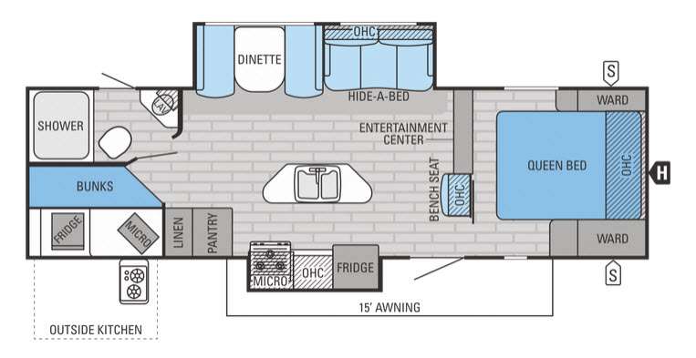 Outside there is an exterior kitchen with a refrigerator, microwave, and two burner range. The 15' awning provides shade from the sun, and the exterior storage provides space for all of your extra gear.