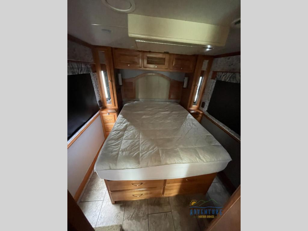 The rear bedroom has a queen size bed with closets on either side of the bed. At the foot of the bed you will find a closet along one side, and on the other side there is a linen cabinet. Above the bed there is an overhead TV for your enjoyment.