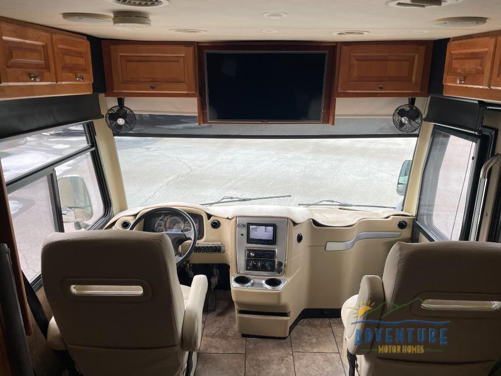 Step into the front entry to find two captains chairs, overhead cabinets, and an optional TV at the center front.