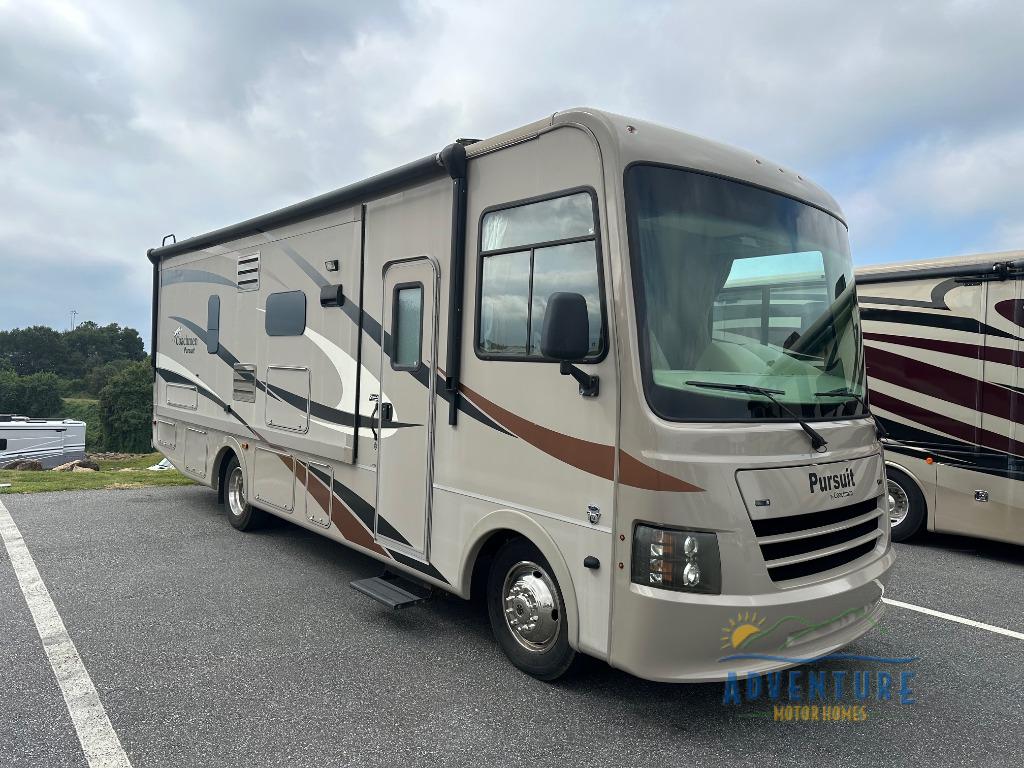 This Coachmen Pursuit class A motor home has everything you need and more to fully enjoy the time you spend away from home. The electric front drop down bunk provides added sleeping space for family or overnight guests.