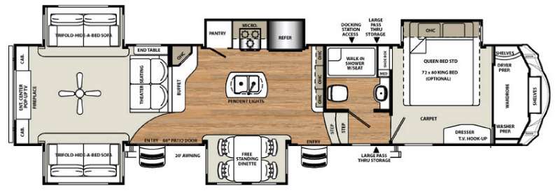 Enter the front side patio door and notice the living space to the left with a full rear wall entertainment center including a fireplace. The perfect place to gather together and reminisce about the days adventure. There are dual opposing slide outs each featuring a tri-fold hide-a-bed sofa. There is also a theater seat for two with one end table. Both sides of the entertainment center feature cabinets for storage.