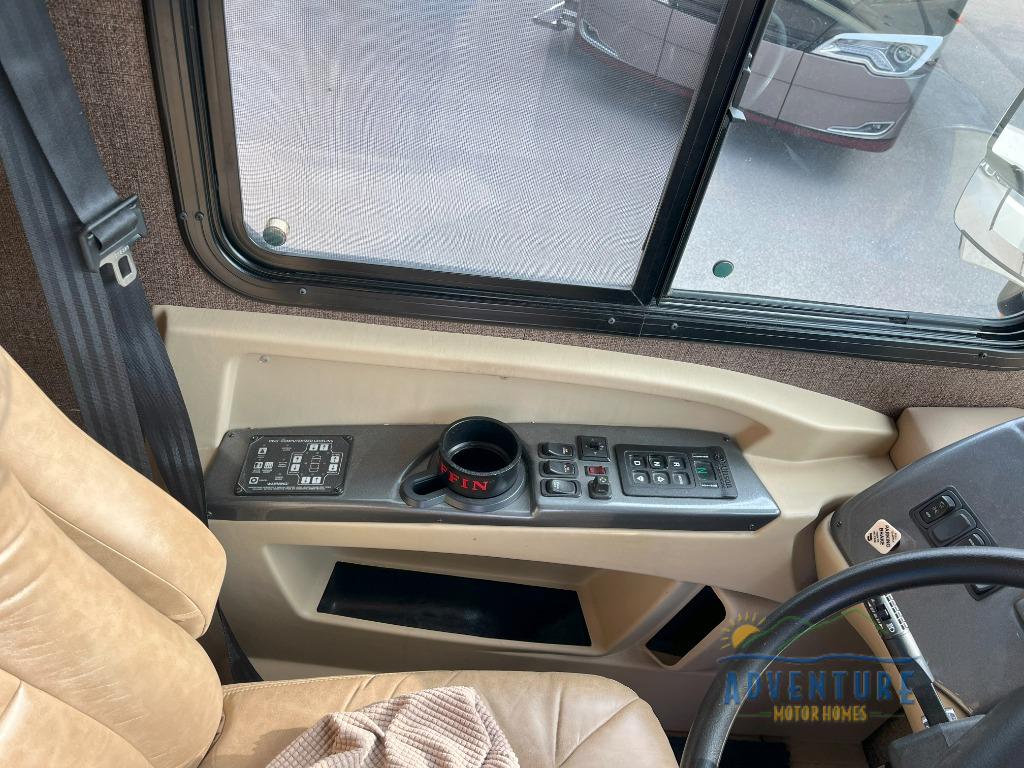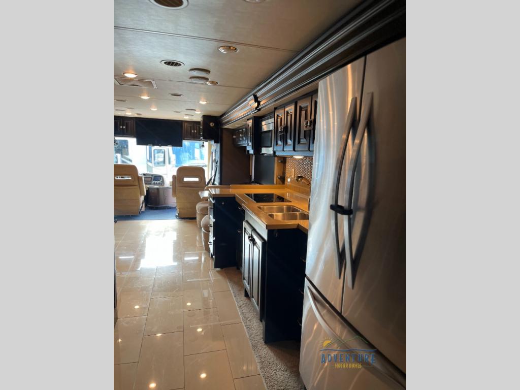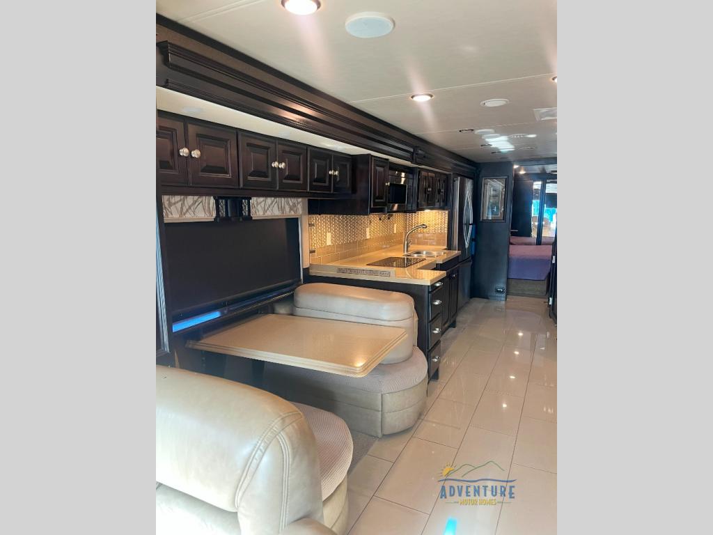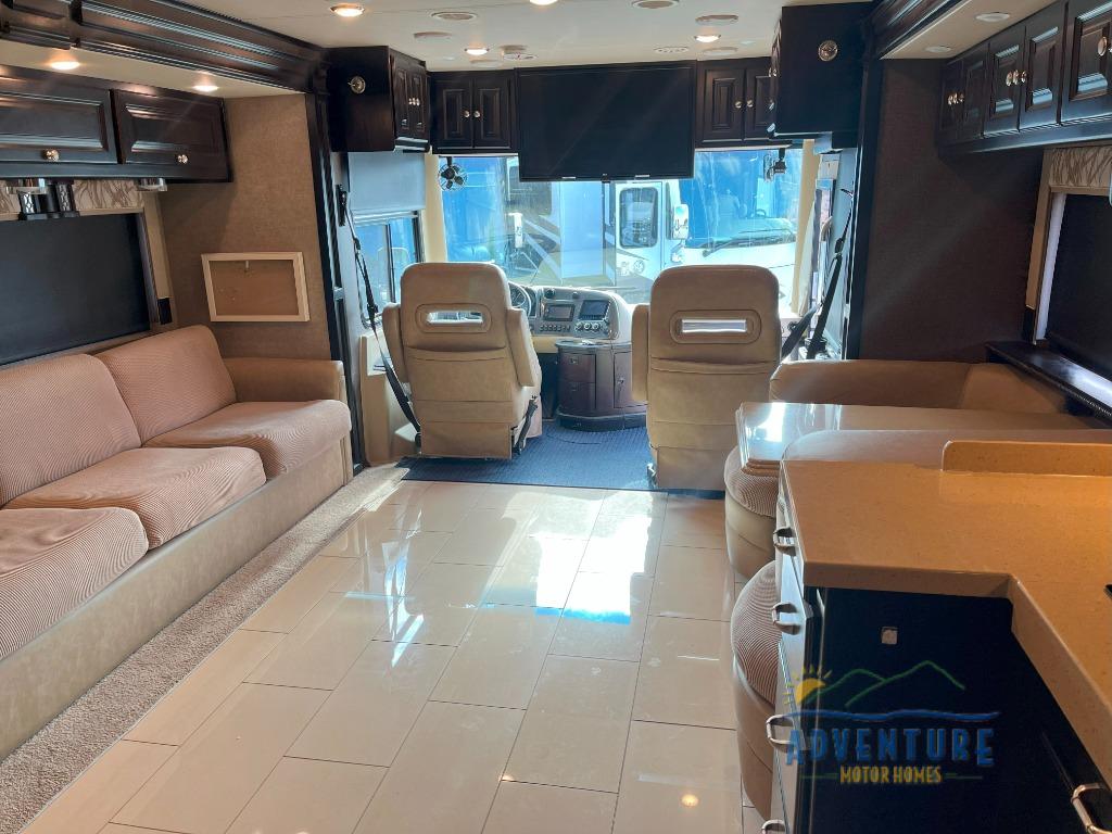 Step inside model 37 PA in front of the passenger seat and take a look back through the coach. You will find a wide open concept living space with dual opposing slide outs right up front. Behind the passenger seat there is a booth dinette with an overhead cabinet, or you might wish to select either a dinette with computer workstation, or a u-shaped dinette instead. This slide also contains a three burner range, double sink, overhead microwave oven, residential refrigerator, and pantry.