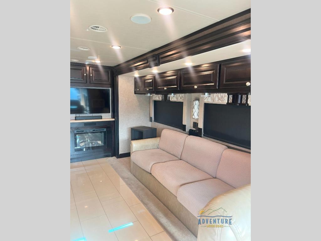 Behind the driver's seat find a standard sofa bed slide out along with a comfortable lounge chair. You could also opt. for a lounge chair and L-shaped chaise sofa bed including coffee table if you wish. Within this slide area along the interior wall there is a standard TV and optional fireplace that will bring in a warm cozy home-like feel.