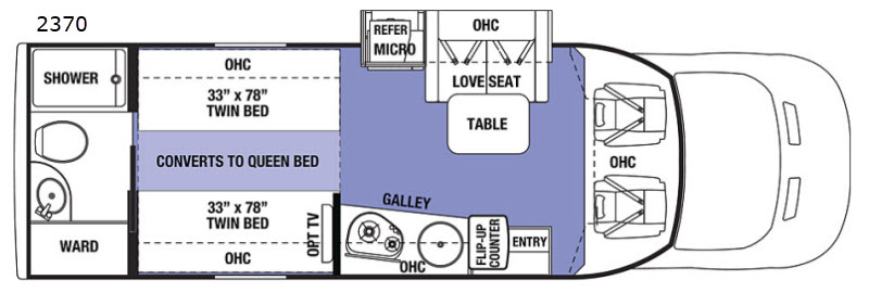 A single slide out and twin beds are what you will find aboard this 2370 Sunseeker TS by Forest River. The full rear bath is perfect for getting ready in the morning. The love seat and table are great for playing games, eating a meal, or just relaxing throughout your trip. The twin beds can easily convert into a queen sized bed if needed. Four seat belts can be found throughout this motor home, so you can bring along a guest or two as you travel!