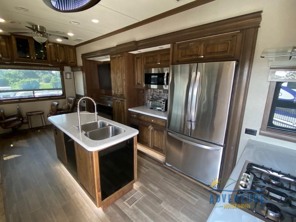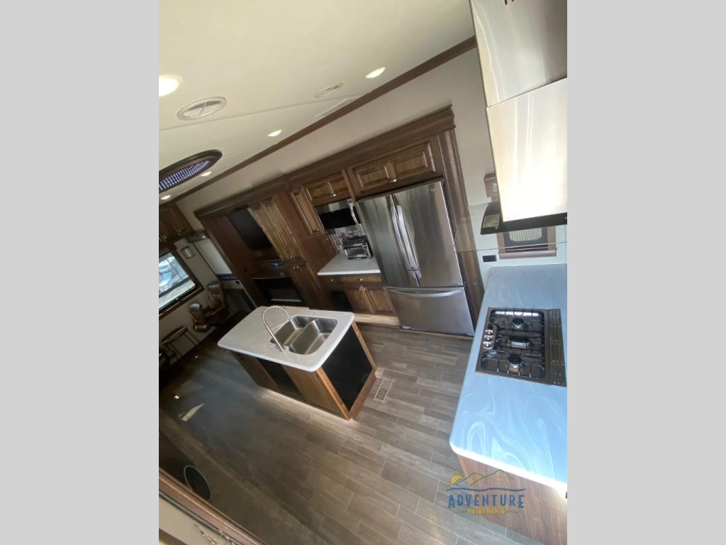 Get ready to camp in luxury when you choose a RiverStone fifth wheel! These models feature residential style insulation as well as roof and flooring touts with an R-38 insulation value which is designed for full time living throughout the country! Inside each model there is a 60" LED Smart TV as well as plenty of residential touches from the Shaw vinyl flooring to the large stainless steel kitchen sinks. There is beautiful upgraded Corian solid surface counter tops in the kitchen and a central vacuum system which makes cleaning up so much easier. The mandatory RiverStone Luxury Package has features such as a Splendid "Astral" stackable washer and dryer, a large infiniti light over the kitchen island, plus a Fischer Paykal dishwasher. Come see for yourself why the RiverStone is desired by many for the luxury and convenience it offers.