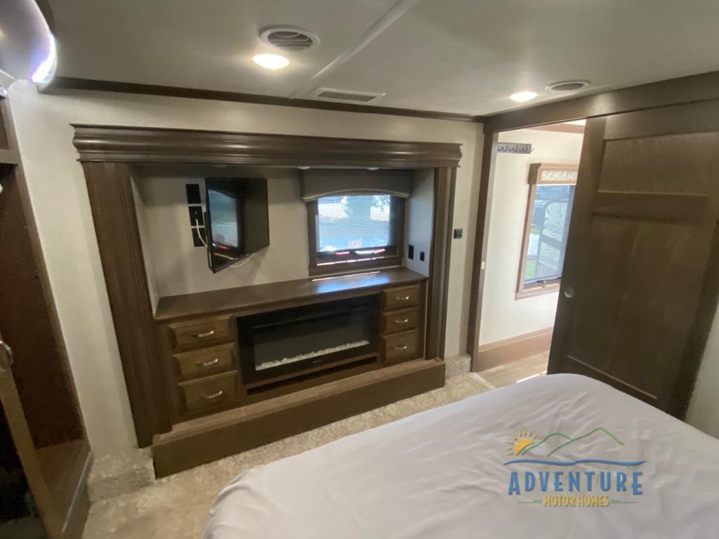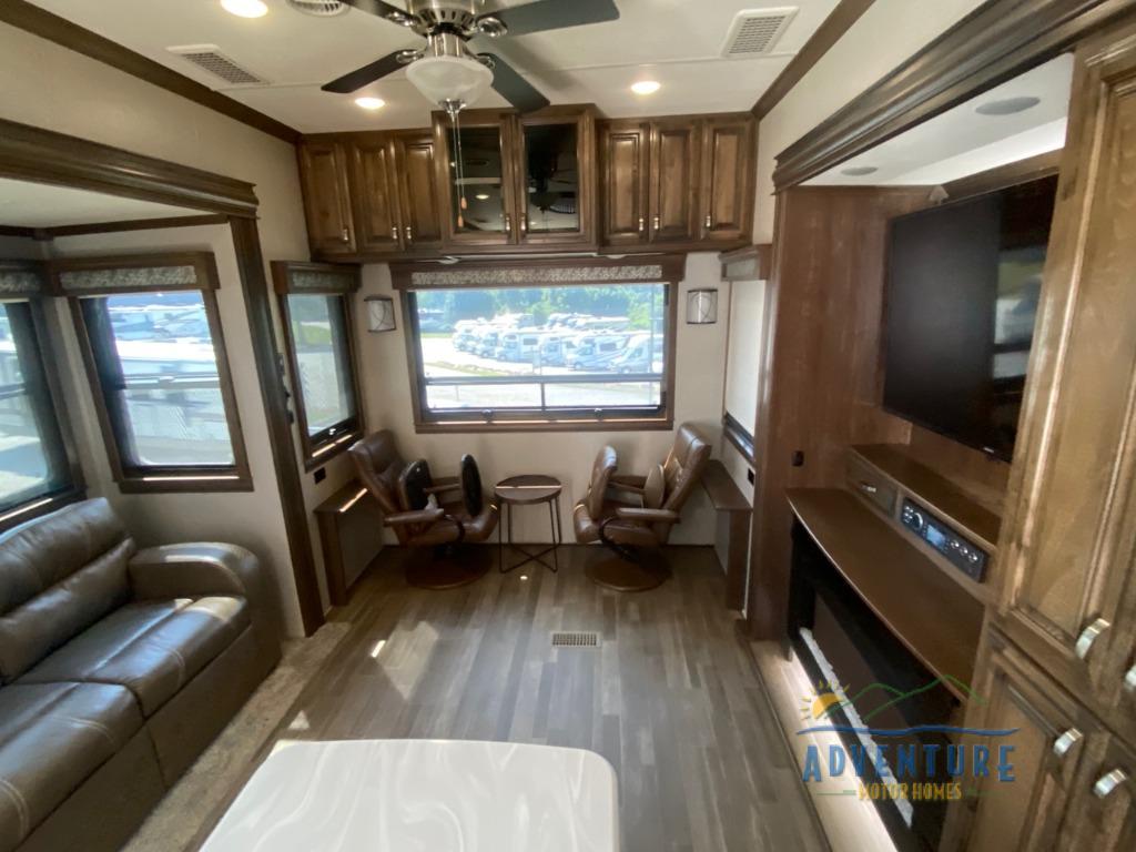 When you are ready to leave the cares of your busy life and enjoy the pleasures of camping, then do so with this quad slide out RiverStone 37IK fifth wheel. In the combined kitchen and living area you can sit and visit at the 80" sofa, the two recliners or at the pull-out dinette. When you are ready to watch a little TV then come do so at the 60" LED Smart TV or enjoy a fire in the fireplace. Meal clean up is a breeze with the island where you will find a double sink plus there is a dishwasher! In the front bedroom there is a king bed plus a 43" TV and more!