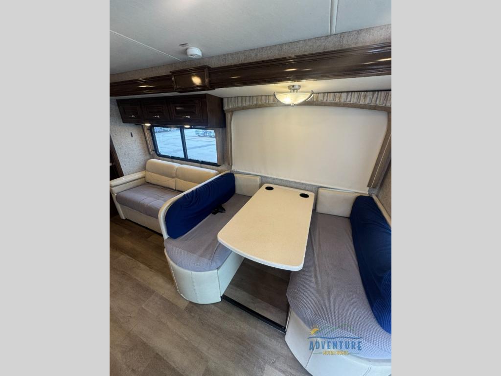Step inside behind the cab area to see a coffee table between the captain's chairs and a drop-down overhead bunk above for extra sleeping space.