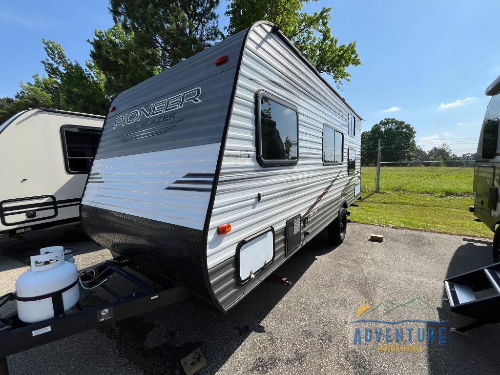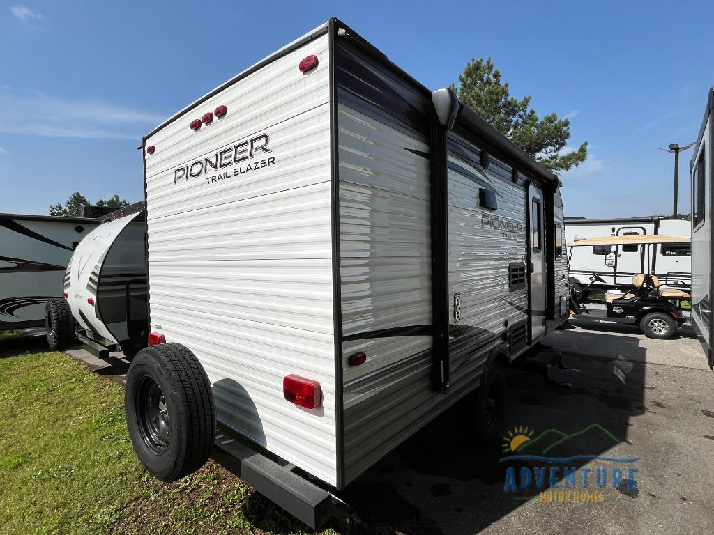 Discover what it's like to be free to roam with this Pioneer travel trailer! As you come inside after a long day of exhausting activities, you will certainly appreciate having your own bathroom where you can rinse off in the shower. Forget about the hassle of starting up a campfire in order to make dinner because the three-burner range will make it easy to cook like you do at home, and if you prefer to make dinner even more simple, you can just grab leftovers from the double-door refrigerator and heat them up in the microwave.