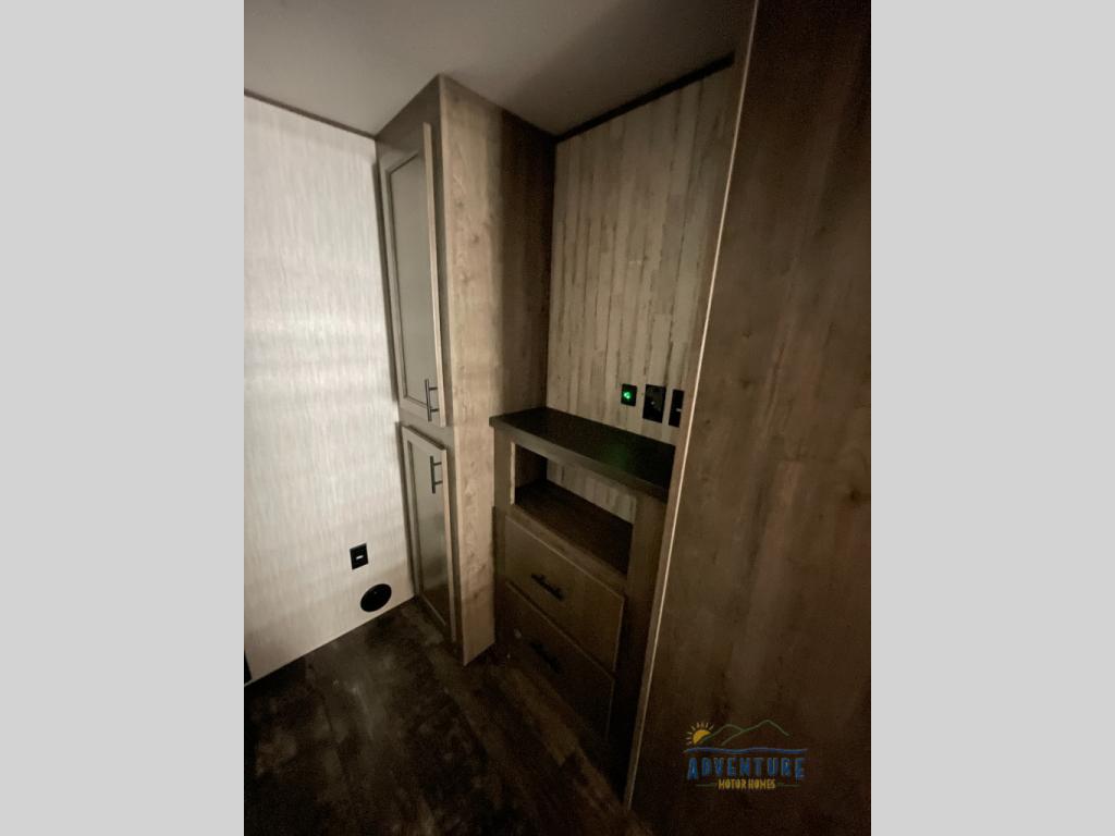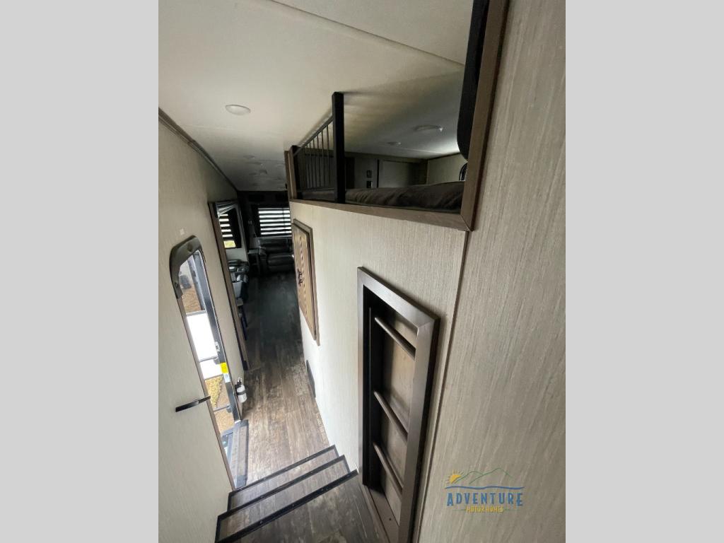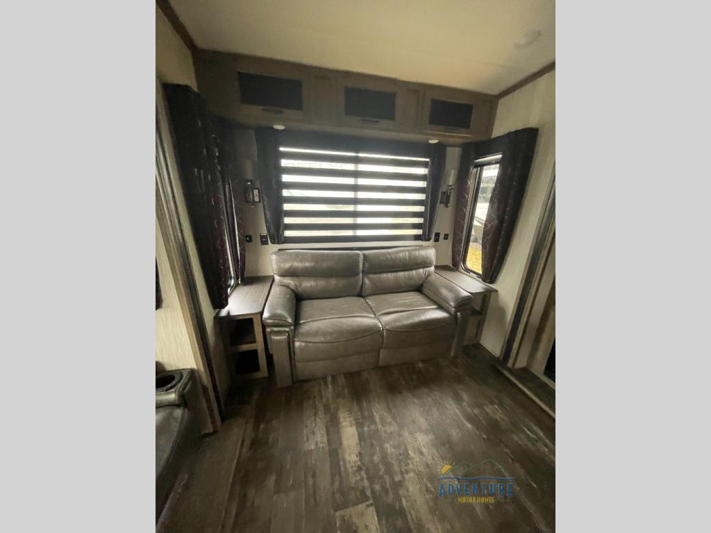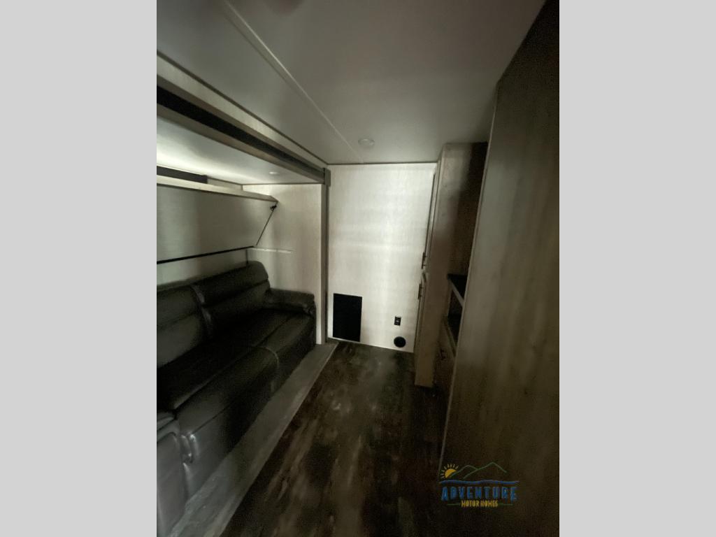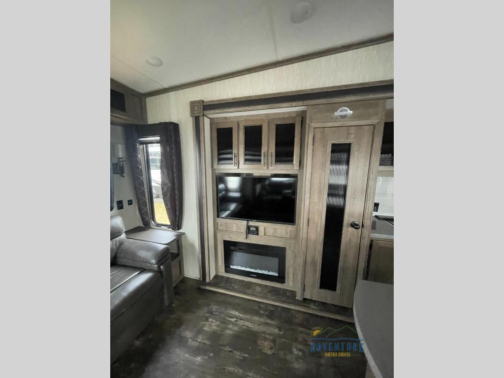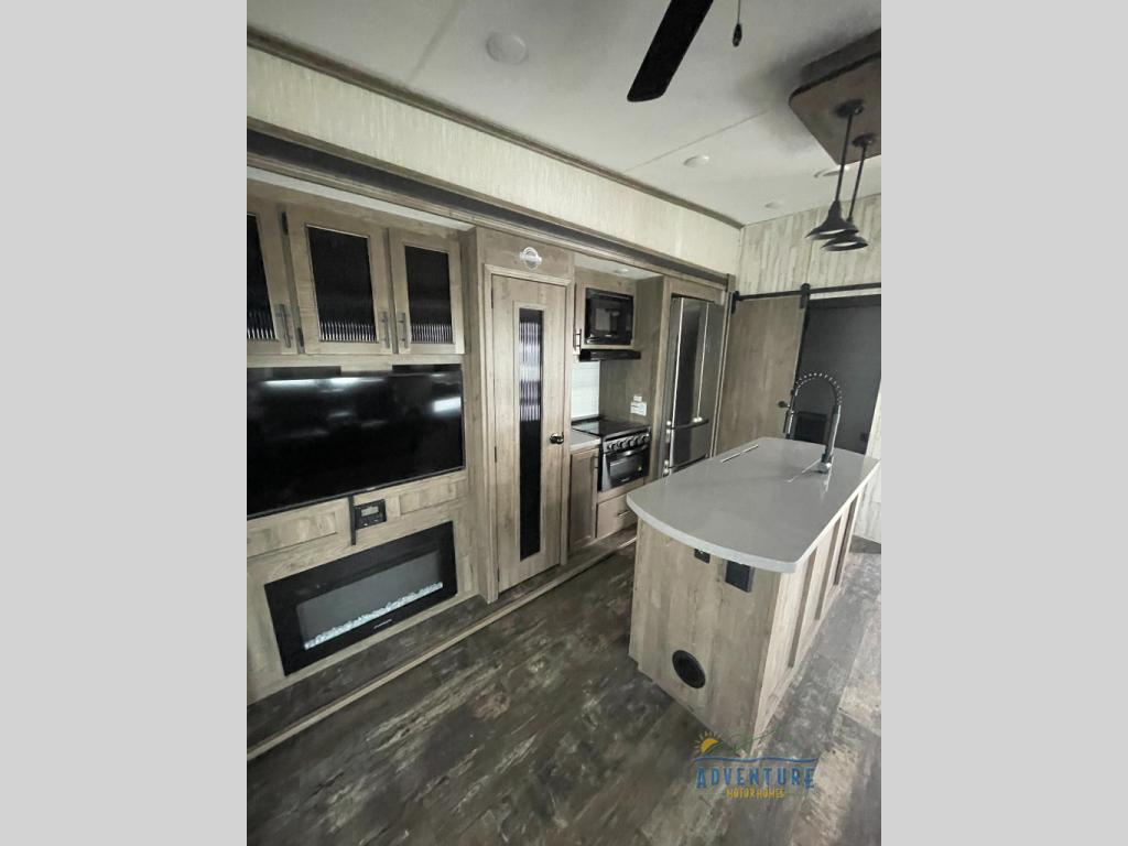 There's something for everyone in this Sabre fifth wheel! From the front private bedroom with a queen bed that can be replaced for an optional king bed and a front closet with an area prepped for the optional washer and dryer, to the second bedroom featuring a jackknife sofa, a trundle bed, a bunk bed, and a loft area above it all, this unit is super accommodating. The kitchen island not only provides extra counter and storage space, but is also makes cleaning up even easier with the farm-style sink and deluxe pull-down faucet. After you have spent a fun day in the sun, head to the rear living area and relax on either the tri-fold sofa which can be transformed into an extra sleeping space or on the home theatre seating with heat and massage. As you sit back and relax, you'll find a fireplace directly across with a large residential TV above it for you to watch your favorite movie!