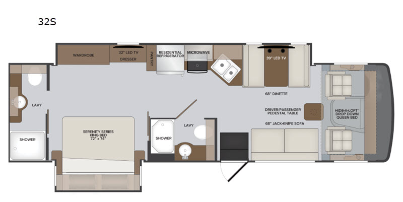 Two full baths, a Hide-A-Loft drop-down queen bed, a Serenity Series King bed, plus many more features makes this motorhome one-of-a-kind! The chef of the family will enjoy cooking breakfast each morning in this kitchen that includes a three burner cooktop, an over the range microwave oven, and a residential refrigerator. You'll find plenty of seating space to relax on, including a jack-knife sofa, a booth dinette, or take your cold drink outside to sit under the electric awning with LED lights. This model features a full-wall slide plus a slide out in the bedroom for even more space and the two full baths makes this unit one you don't want to pass up!