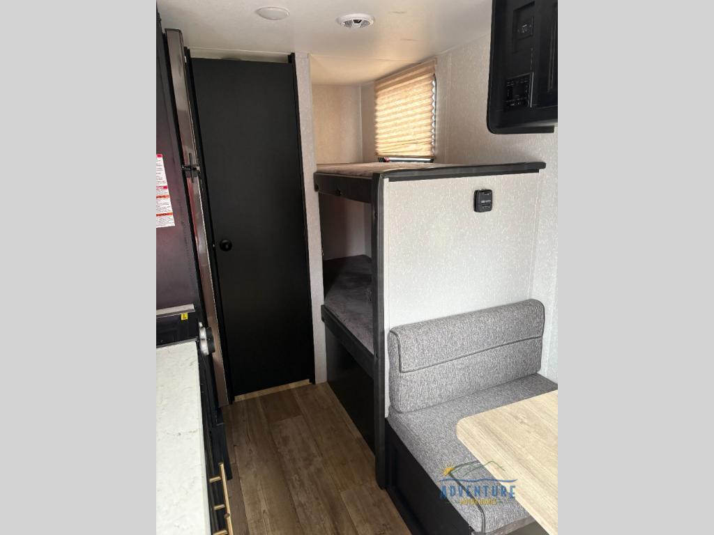 Imagine your kids on the rear bunk beds in this Cherokee Wolf Pup travel trailer while you enjoy the front queen bed before everyone gets up to make breakfast and head out for a hike. The kitchen includes a high-output cooktop and microwave, as well as a refrigerator to store your leftovers and a sink to wash the dishes. You will find storage in the overhead cabinets, and there is a shelf by the queen bed. Your hiking gear can also be stowed out in the outside storage.