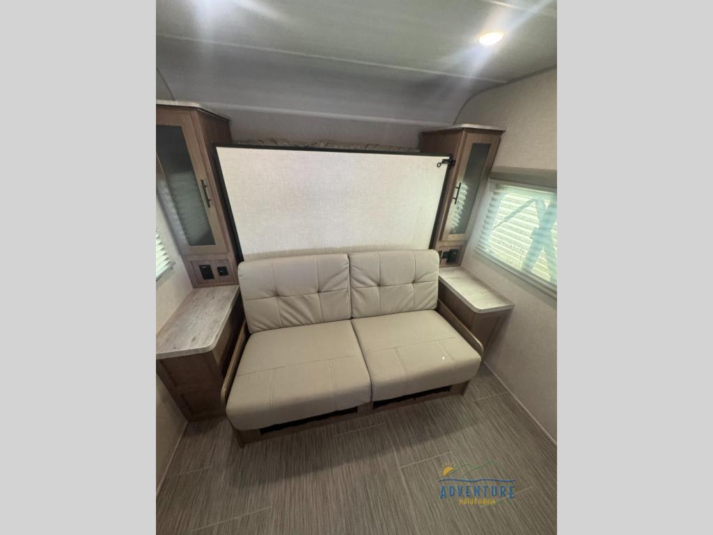 If you haven't experienced the versatility of a Murphy queen bed that can fold out when you need it at night and hide away during the day when you need the sofa, give it a try! You will also find a sofa on the single slide that pushes out to reveal more interior living space. The breakfast bar provides countertop space for dining or visiting with the cook. This can be the perfect couple's trailer, yet a child or guest can sleep on the sofa. Everyone can take turns getting cleaned up in the radius shower in the rear corner bathroom, and some campers can hang out outdoors under the 16' power awning that offers an outdoor living area once you add your camping chairs.
