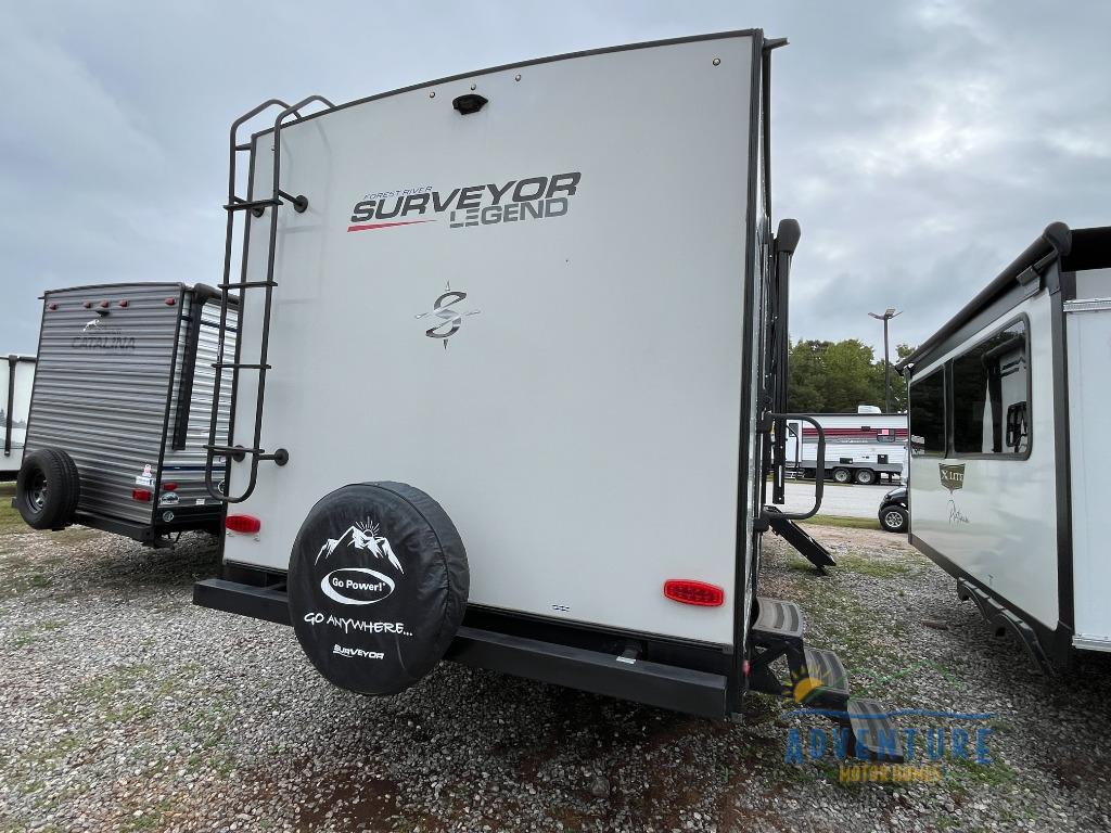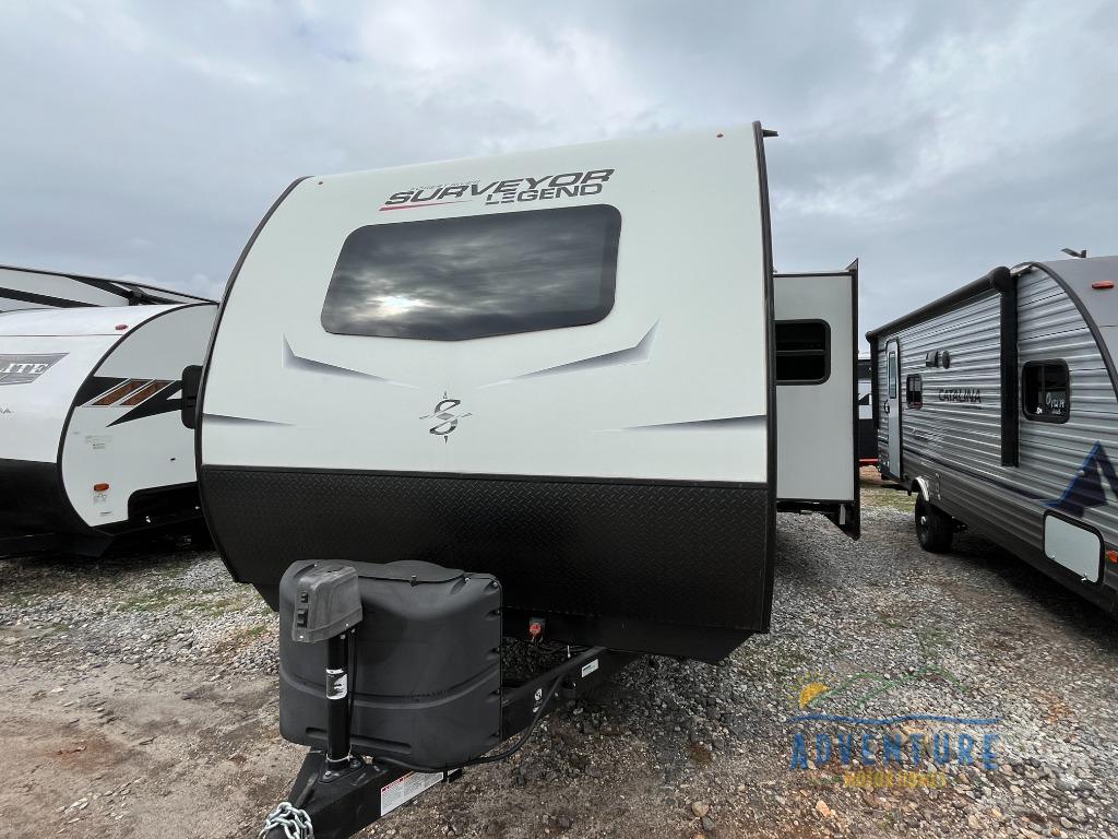 Only the Forest River Surveyor Legend travel trailer can inspire legendary adventures! The gel-coated fiberglass exterior is outfitted with front diamond plate protection, an integrated front windshield, preparations for rooftop solar power and a rear camera, and an adjustable platform step on the main entry. You'll be able to use the exterior LED speakers whenever you want to play music or a podcast, and the designer Shaw linoleum flooring is a quality base that will clean up easily if you track mud indoors. There are vented side windows in the slide outs so that you can bring in some fresh air, and each model is ready for cable/satellite.