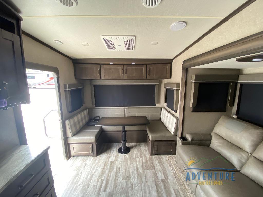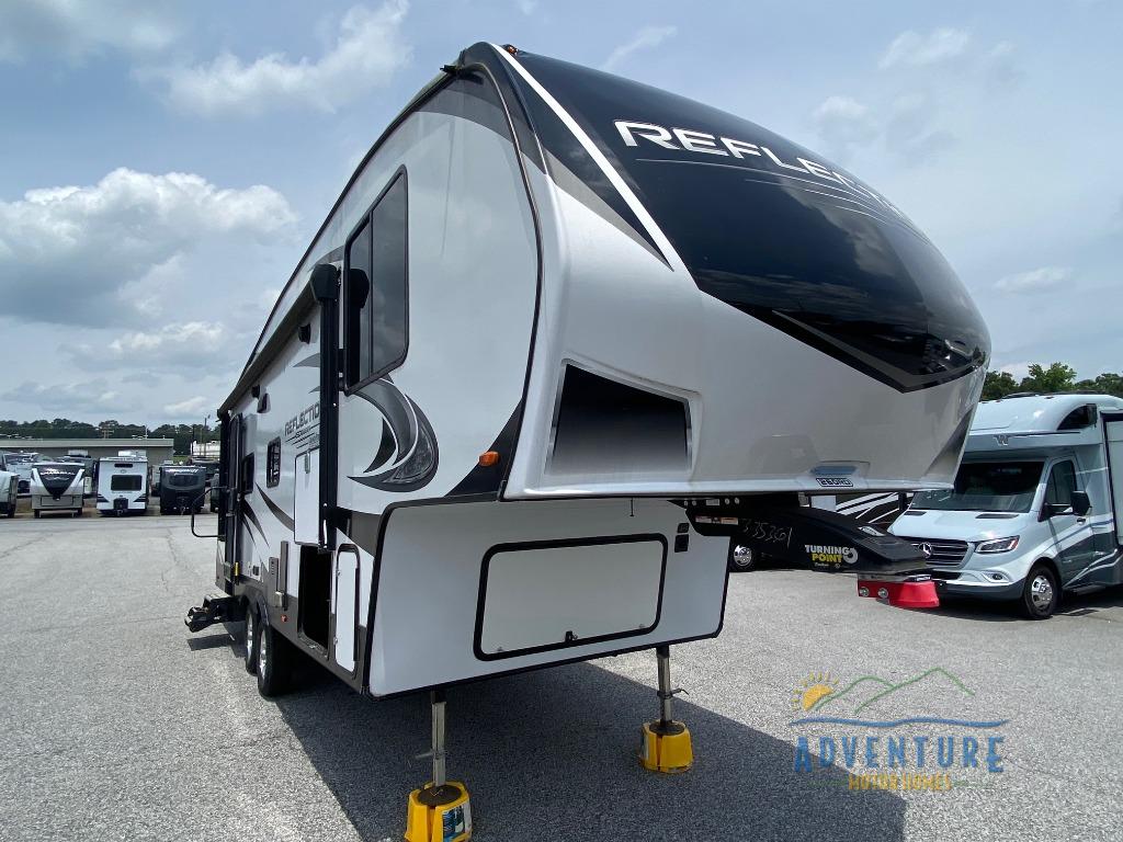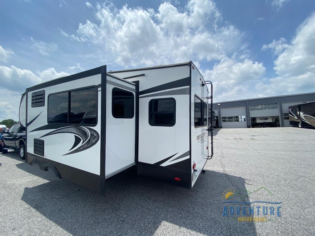 Load up lots of cold food in the 12-cu. ft. refrigerator to enjoy a weekend away from it all in this Reflection 150 Series fifth wheel! The dry food can be placed in the pantry and overhead cabinets, depending on where you want everything. You will enjoy having the appliances near by to make a warm meal in the L-shaped corner kitchen that is next to the entry. Head outside to sit under the 18' electric awning, and you can grab your camp chairs from the exterior unobstructed pass-through storage. You might prefer to dine at the U-shaped dinette with a view and watch TV from the theatre seating that has a massage feature. At night, you can get cleaned up in the 30" x 36" shower with skylight and fall quickly to sleep on your own queen bed.