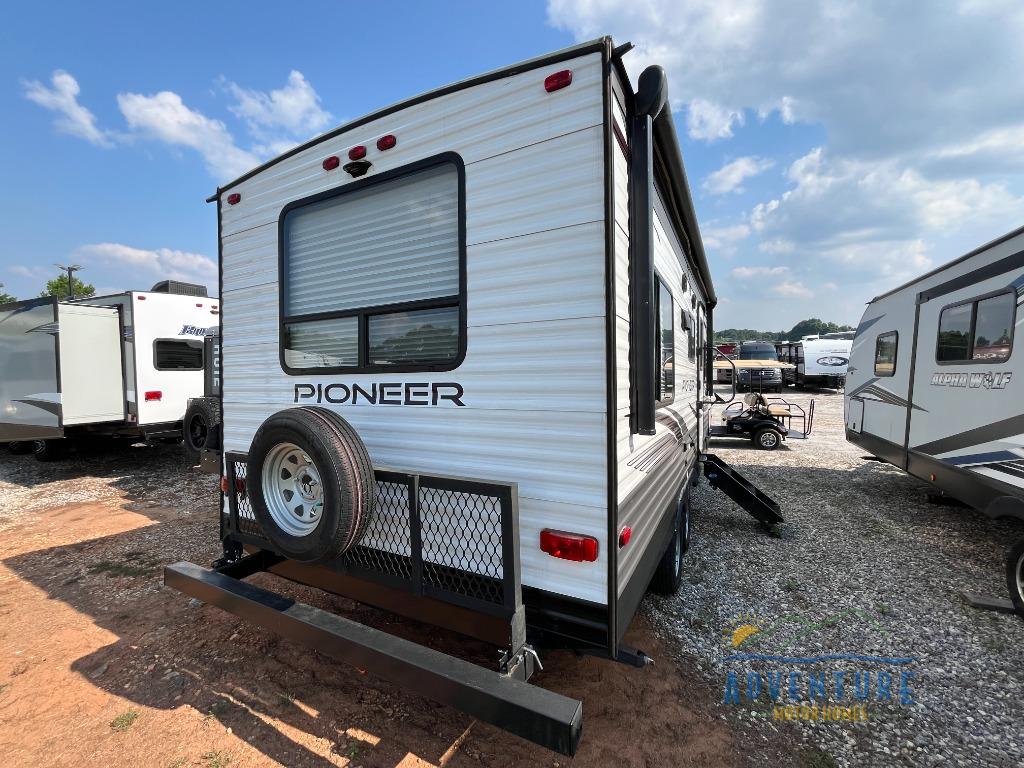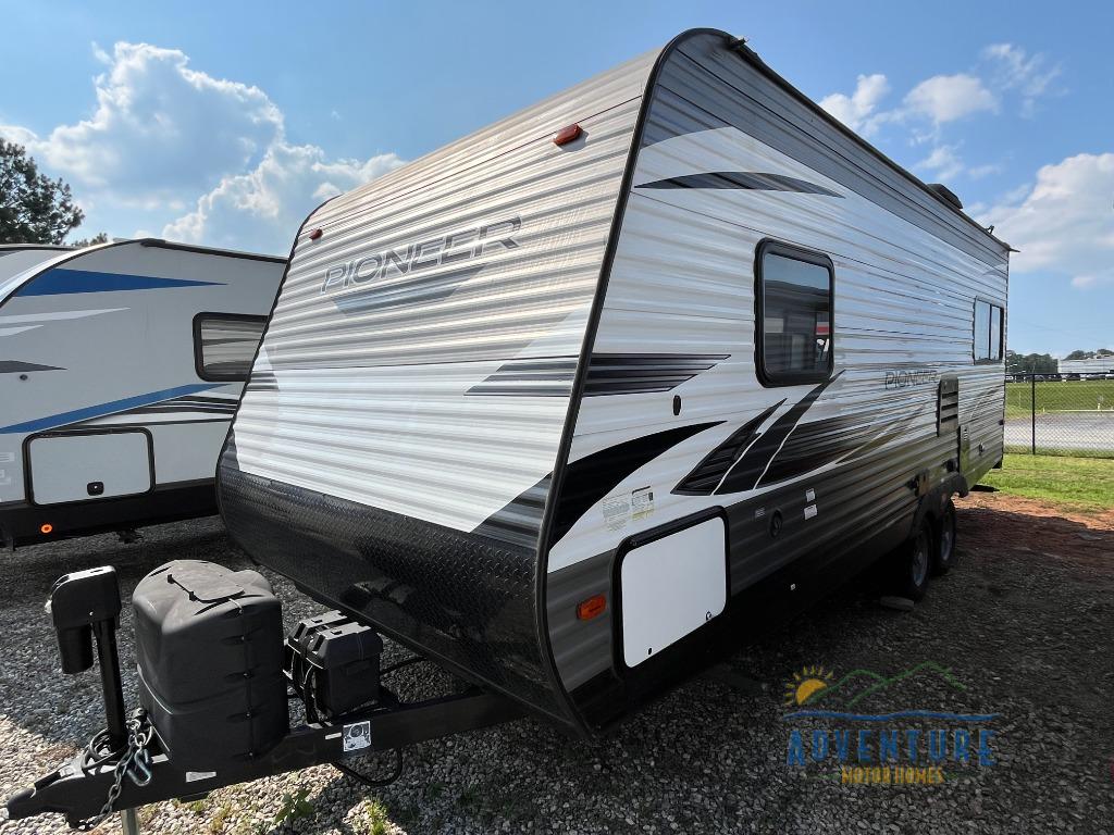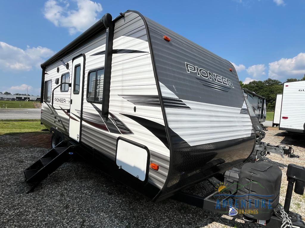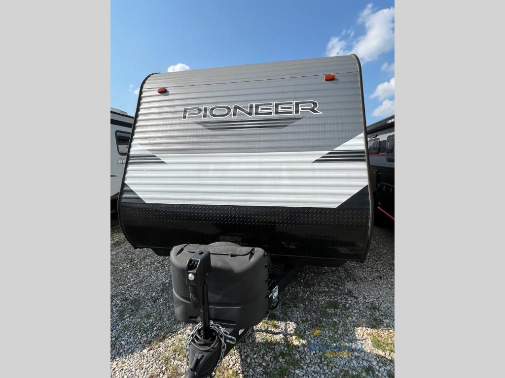 Each one of these Heartland Pioneer travel trailer and toy haulers will lead the way to a comfortable camping trip! The fresh modern décor and carpet free interior creates a comfortable atmosphere. The hybrid aluminum front profile features an aerodynamic radius front cage structure for better wind and water deflection, as well as adds strength. An EZ Camp package comes with black tank flush, an outside shower with hot and cold water, LP quick connect, outside TV hookup to watch the big game, and a flip down secure step with a XL handle to make it easier entering and exiting. With the Pioneer power pack, you will get power stabilizer jacks, a power tongue jack, and a power awning to socialize underneath rain or shine. Don't leave your bikes, wood, or coolers behind either, simply store them with the flip-down storage rack!
