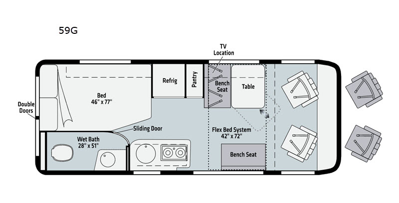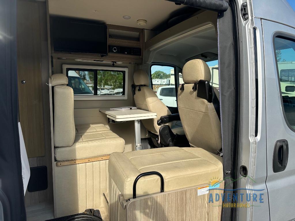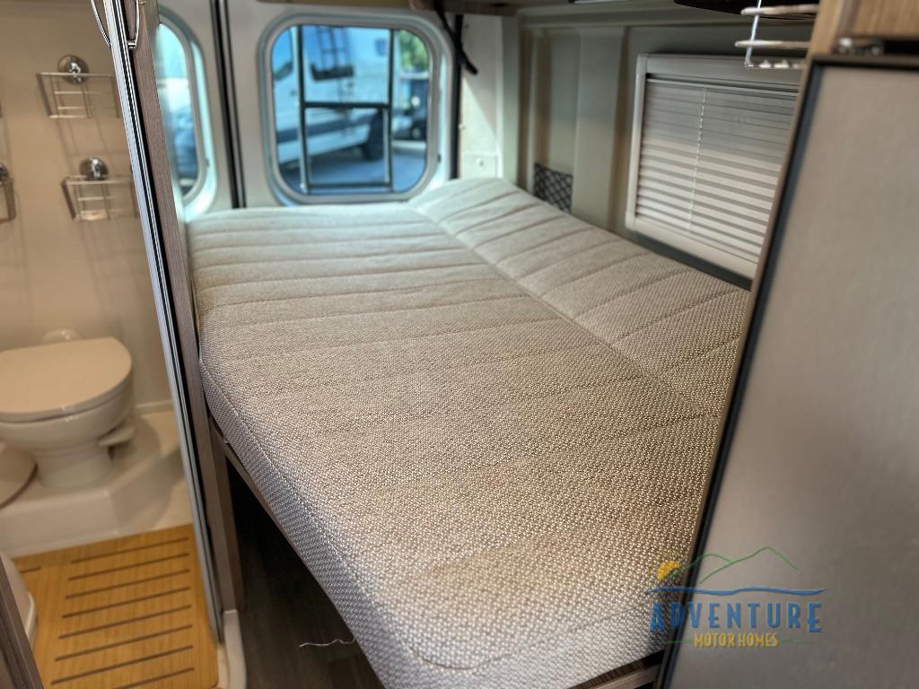 Set out on a new adventure in this Class B motorhome. The swivel captain's seats feature adjustable lumbar support and comfortable armrests so you will enjoy the drive just as much as the destination. You can prepare meals each day on the two burner cooktop and the flip-up countertop extension will provide space to cut fresh veggies. There is also a pantry and a two door refrigerator/freezer to store food for the week. The bench seat with a table gives you a place to dine at each day, and there is a second bench seat for a guest. At night, this area converts to a Flex Bed System, plus there is a full-size bed in the back for you and your spouse!