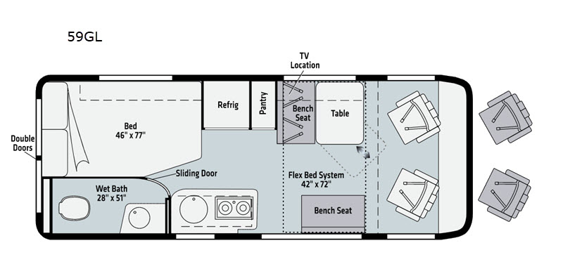 Set out on a new adventure in this Class B motorhome. The lithium Pure3 Advanced Energy System provides 9,500 usable watt-hours of stored energy for extended power on your trip. You can prepare meals each day on the two burner cooktop and the flip-up countertop extension will provide space to cut fresh veggies. There is also a pantry and a two door refrigerator/freezer to store food for the week. The bench seat with a table gives you a place to dine at each day, and there is a second bench seat for a guest. At night, this area converts to a Flex Bed System, plus there is a full-size bed in the back for you and your spouse!