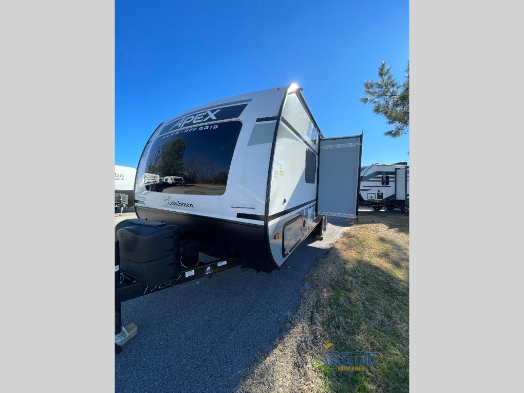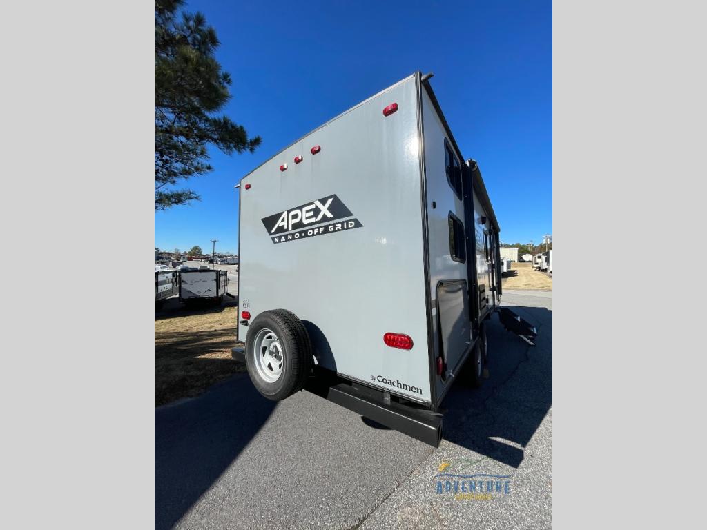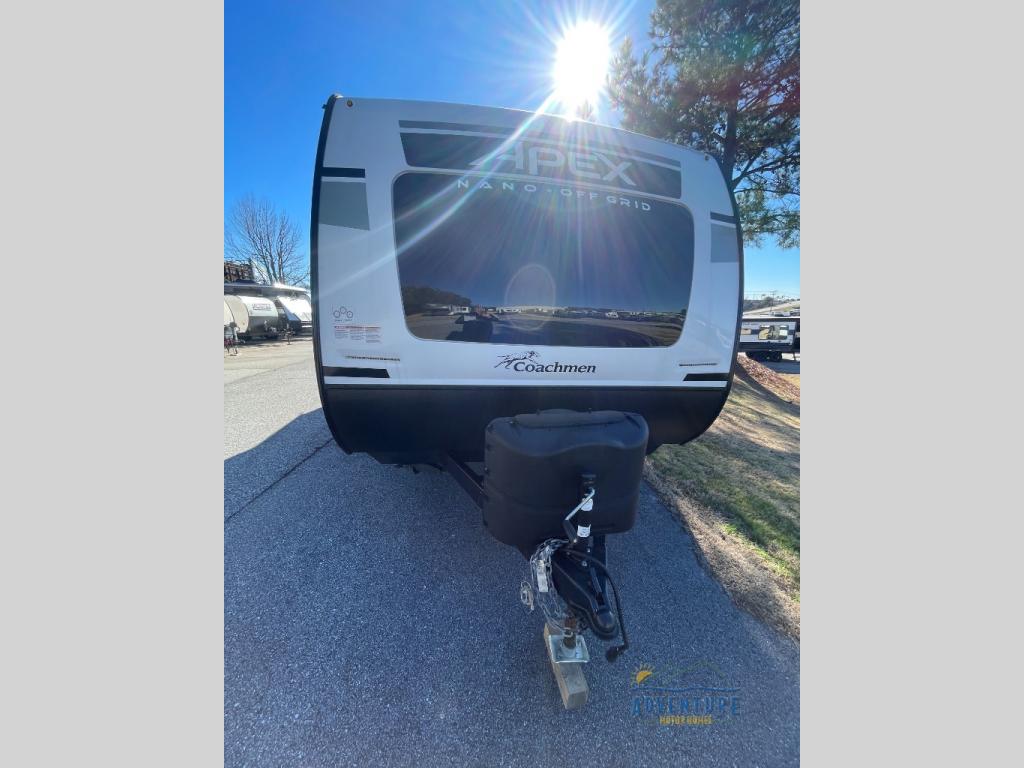 You will find comfort, convenience, and a sturdy construction with each of these Coachmen RV Apex Nano travel trailers! They are held together with an aluma-cage construction, an I-beam chassis, plus vacuum-bonded laminated dual Azdel fiberglass walls for double the protection against the elements. The 200-watt solar panel with a 30 amp control charger is included within the Off-Grid Package, along with two 20 lb. LP tanks, a high velocity power roof vent, plus 12V outlets to keep you powered up. More exterior feature include a hot/cold shower, four stabilizer jacks, a power awning with LED lighting, and magnetic baggage door catches to easily pack and unload your gear. You will love the interior of your Apex Nano with Congoleum residential flooring, one-piece seamless edge countertops, matte black hardware in the galley, and a hand-crafted wood medicine cabinet in the bath.