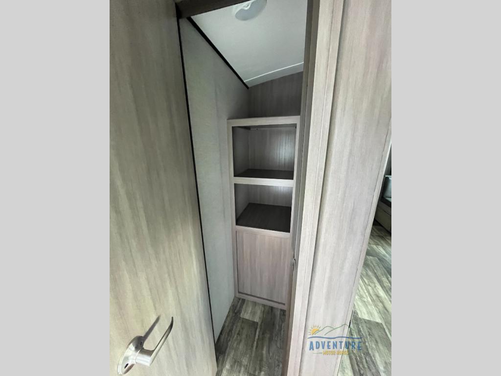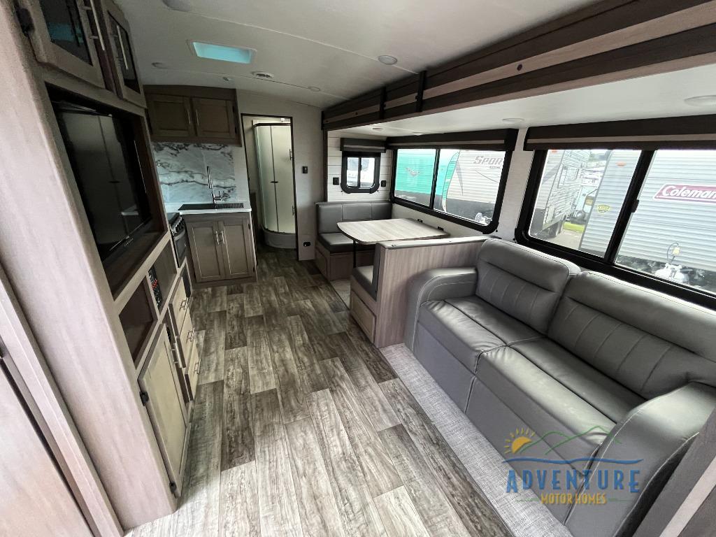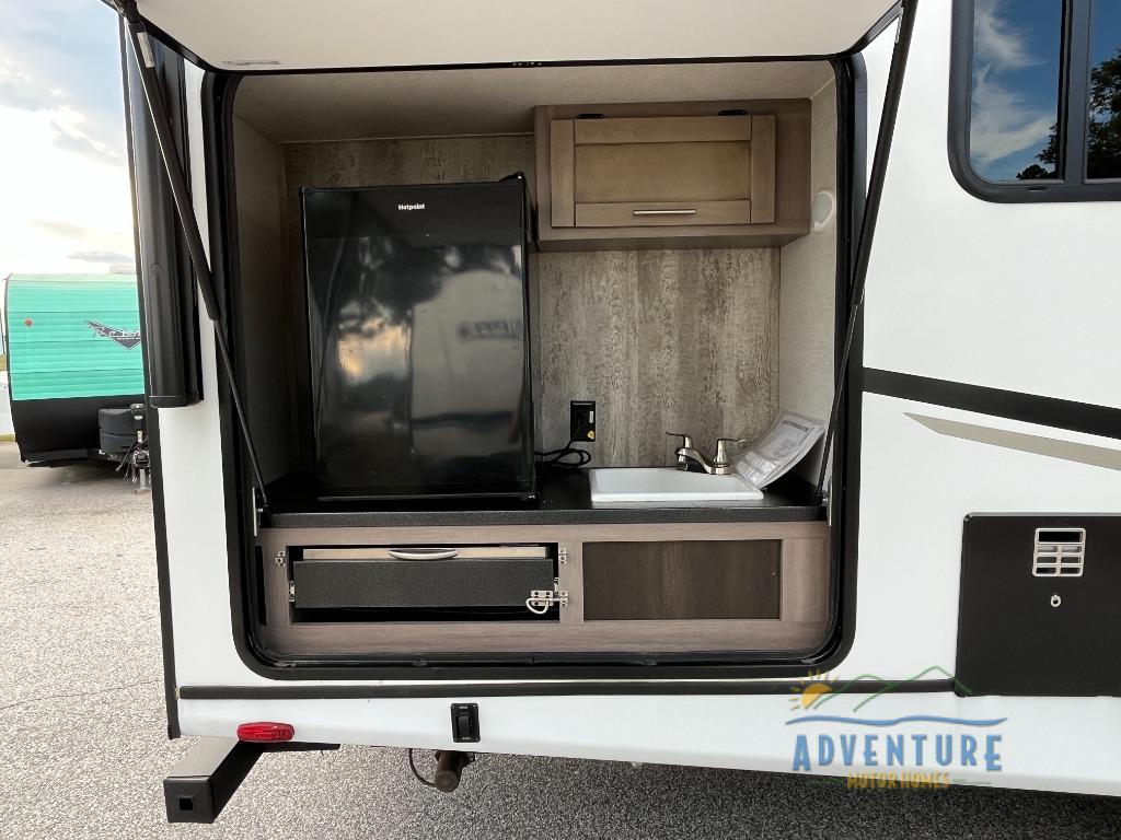 You will love the added interior space you have in this travel trailer thanks to the large slide out in the main living area. Here, you'll enjoy playing cards at the XL booth dinette and relaxing on the tri-fold sofa. Make home-cooked meals on the glass top range or use the exterior camp kitchen. There is even an exterior refrigerator for cold drinks, and the power awning will shade you from the hot summer sun. This model features a full rear bath for added privacy, and the shower skylight will allow natural light in. The front private bedroom includes a king bed, dual wardrobes, plus a shoe storage and pet station for your convenience!