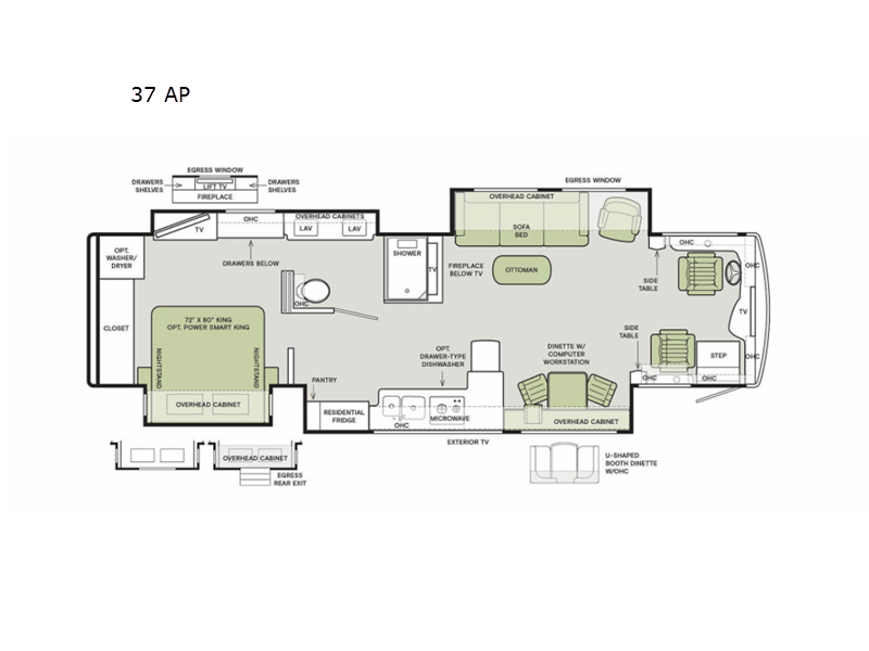 Head across the country in this luxurious coach with four slides, sleeping space for four, and residential appointments. Your crew can get comfortable on the sofa bed with an ottoman in front of it, and there is a flat-panel TV and a fireplace here that will make it feel more like home. You will also find an Ultraleather recliner and a dinette with a computer workstation that will allow you to get some work done while you're away from home. This model features a dual entry bath with dual bath sinks and a luxurious solid surface shower with a glass door. You will feel right at home in the master bedroom that includes a king bed, a large closet, a flat-panel TV, plus an optional washer and dryer.