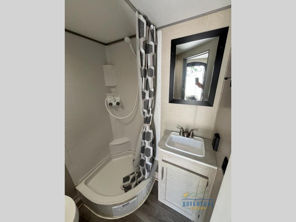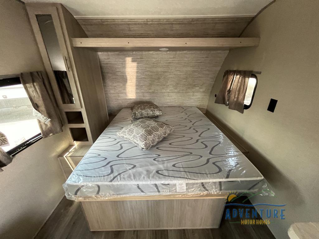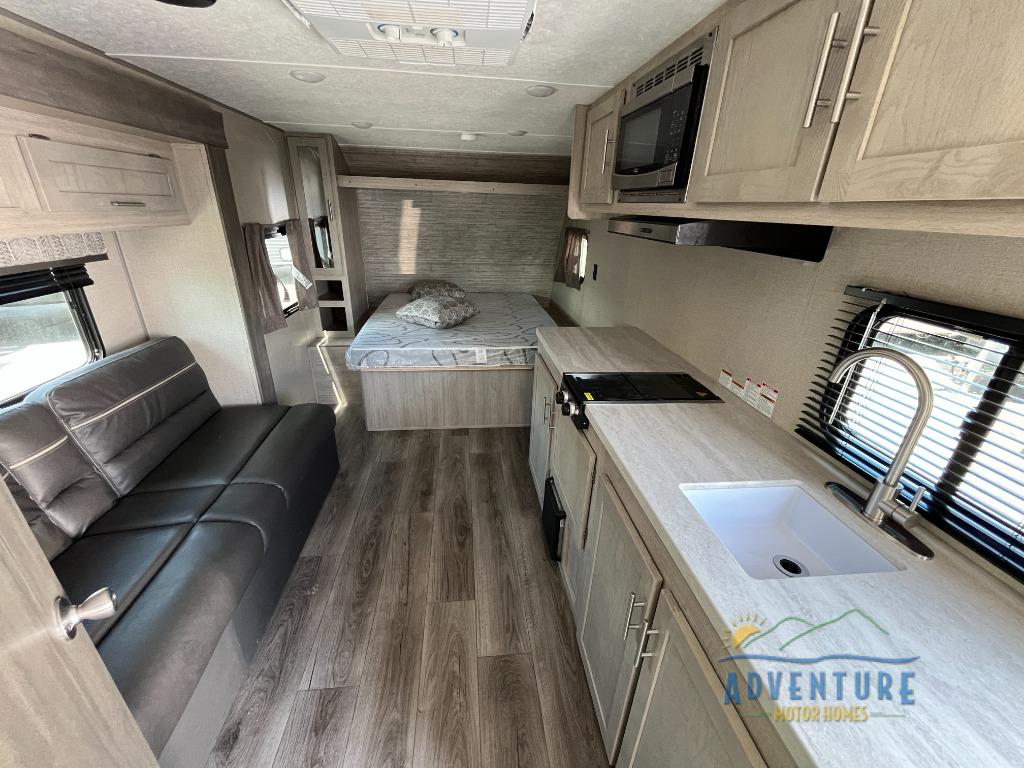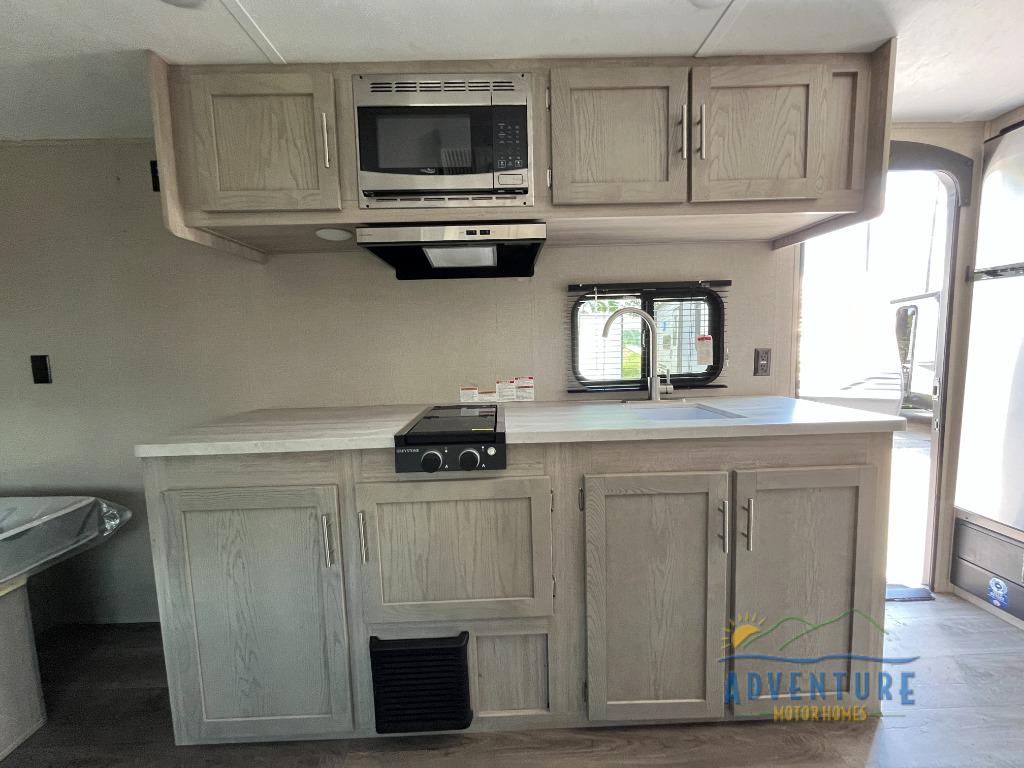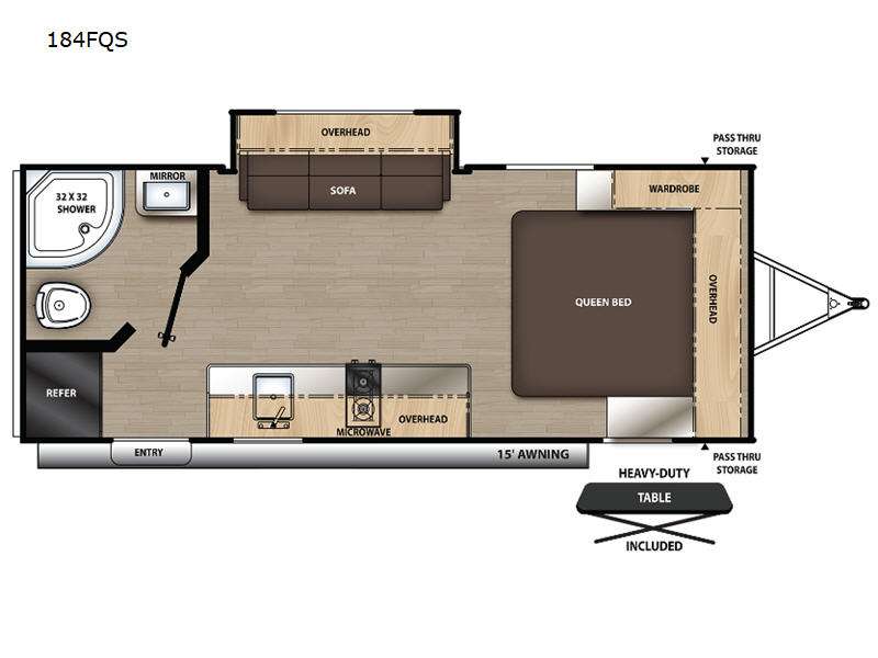 When you're ready to escape the hustle and bustle of the city life, head to the woods in this cozy travel trailer for two or four. The sofa slide out with a table will provide a place to relax, eat, and even sleep an overnight guest. Preparing at-home meals each day will be a breeze with a two burner cooktop and a microwave oven, plus there is ample counter space for your work in the kitchen. The spacious full bath on board means you won't have to use the camp's facilities, and the front queen bed will make this model feel just like home. After dinner is cleaned up, head outdoors to relax under the 15' electric awning with multicolored LED lights and a remote. Camping has never been easier!