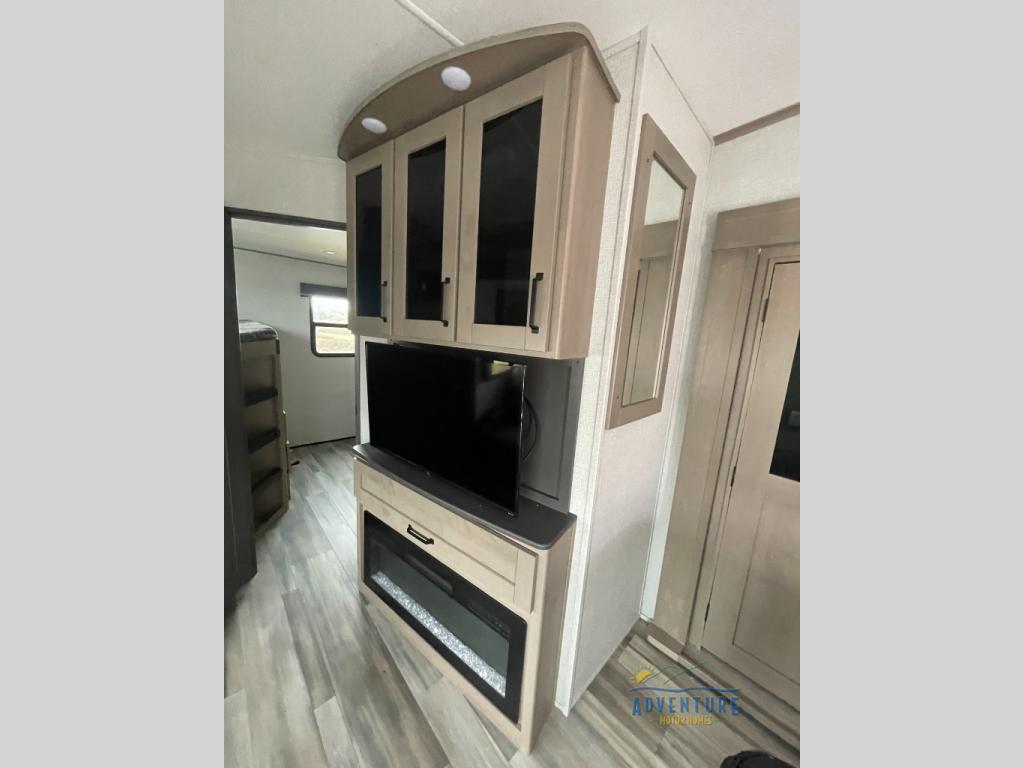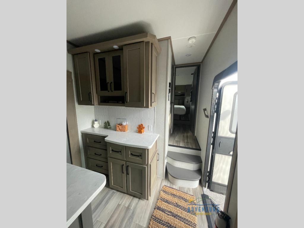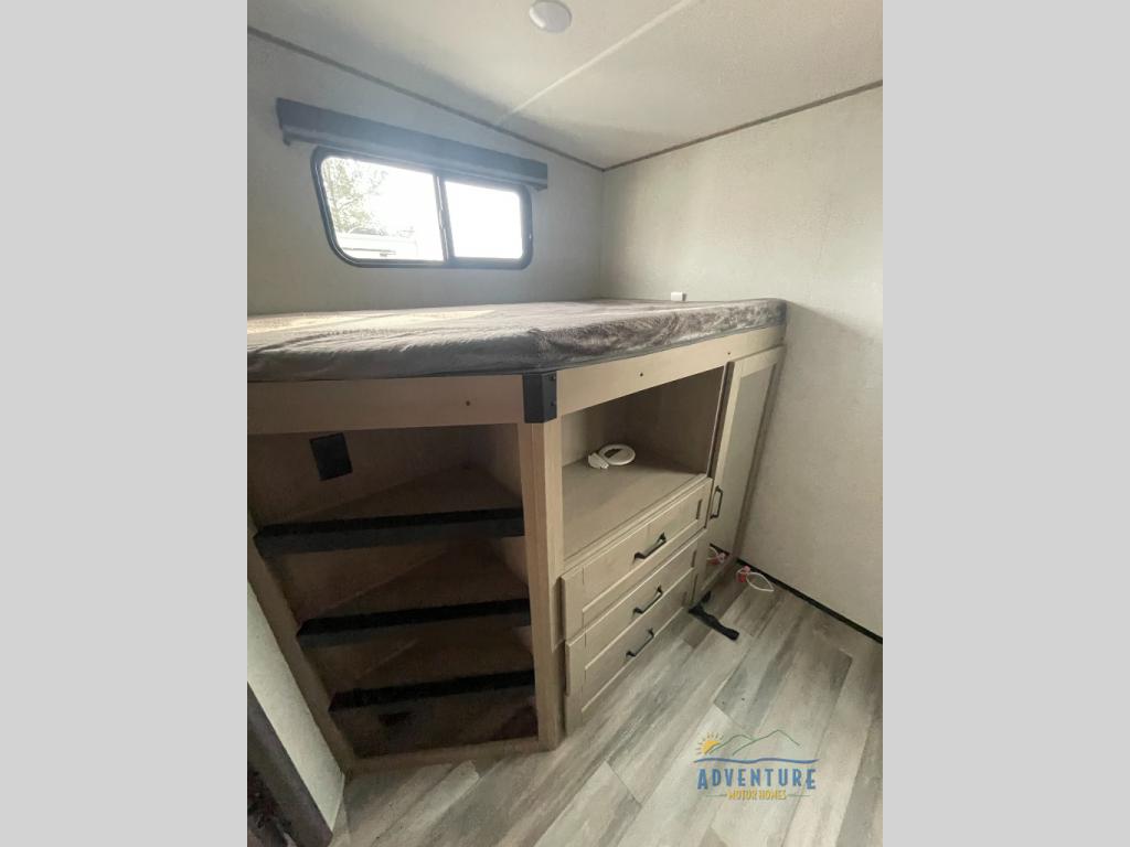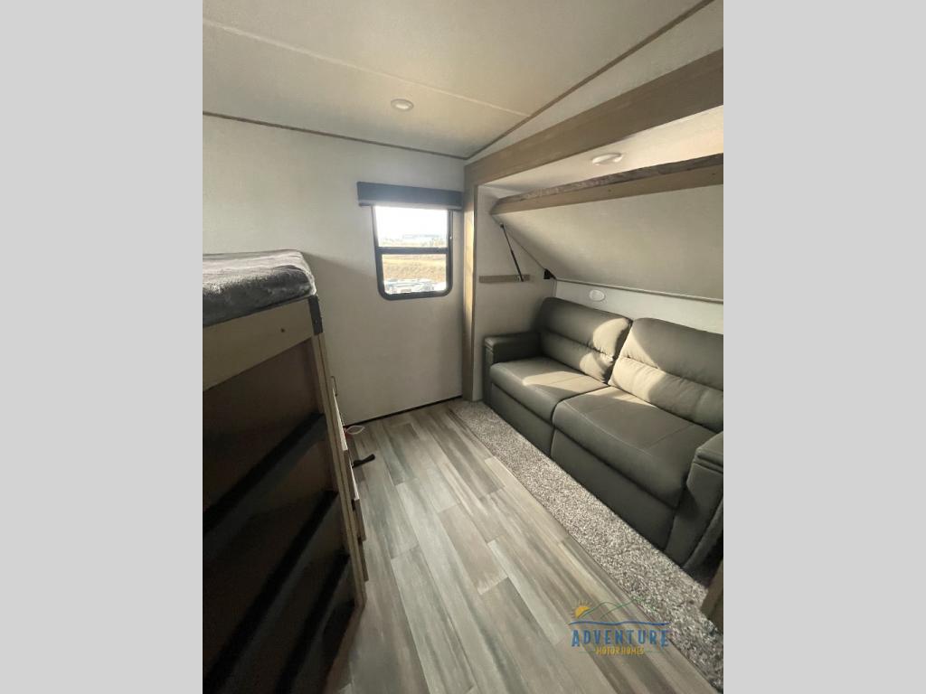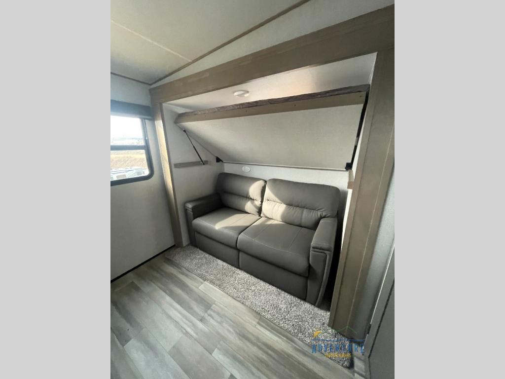 Are you looking to travel with your family and friends and want enough space for everyone to be comfortable? Step inside using the AXIStep, to find a private bunkhouse in the rear of this fifth wheel which offers a slide out flip bunk above a tri-fold sofa, a bunk bed and storage on the opposite side, its very own private half bathroom. The theater seating or tri-fold sofa option is a great place to unwind at night in front of the entertainment center with a 40" LED HDTV and fireplace below it. There is a booth dinette or you can choose a free standing dinette option to dine at, and the kitchen island will provide more counter space to prep meals. You will find full amenities including a 16 cu. ft. 12V refrigerator and a hutch. This fifth wheel also includes a double entry bathroom with a radius shower with a skylight, and you can wake up refreshed each morning after sleeping on your own queen bed.