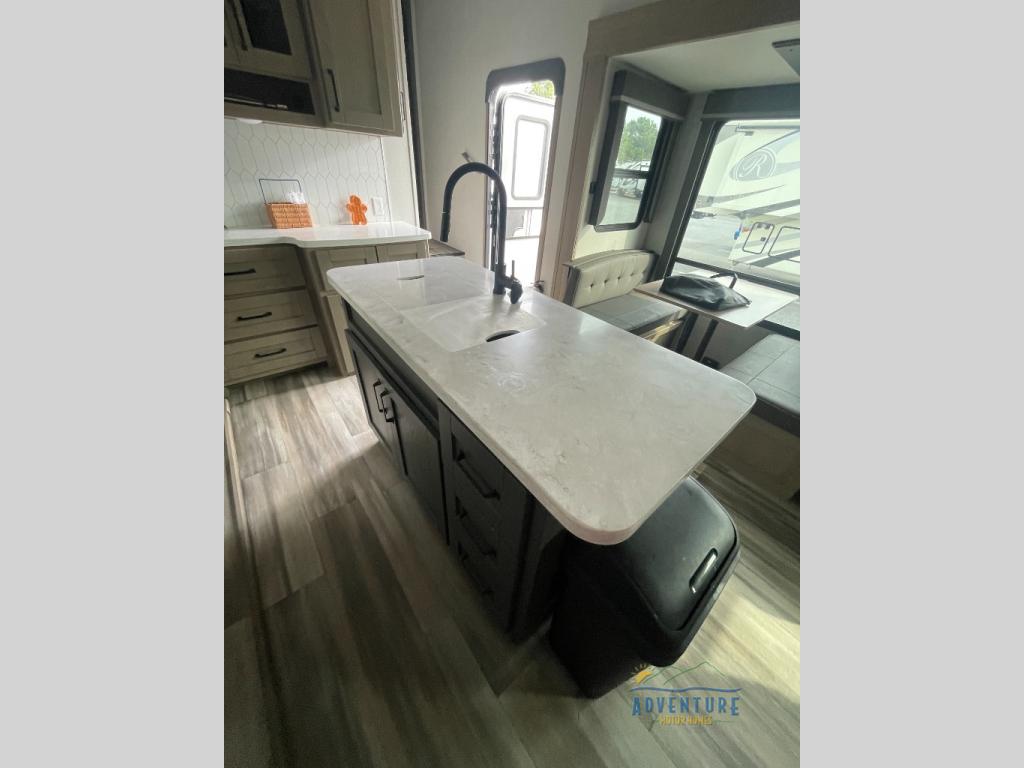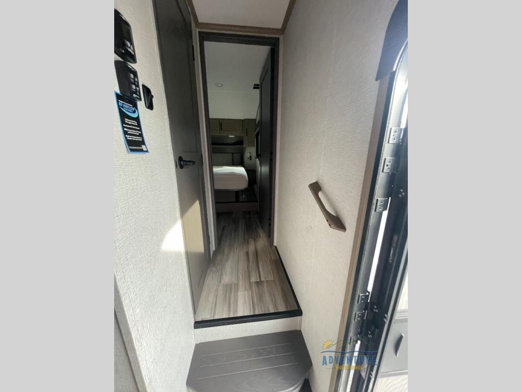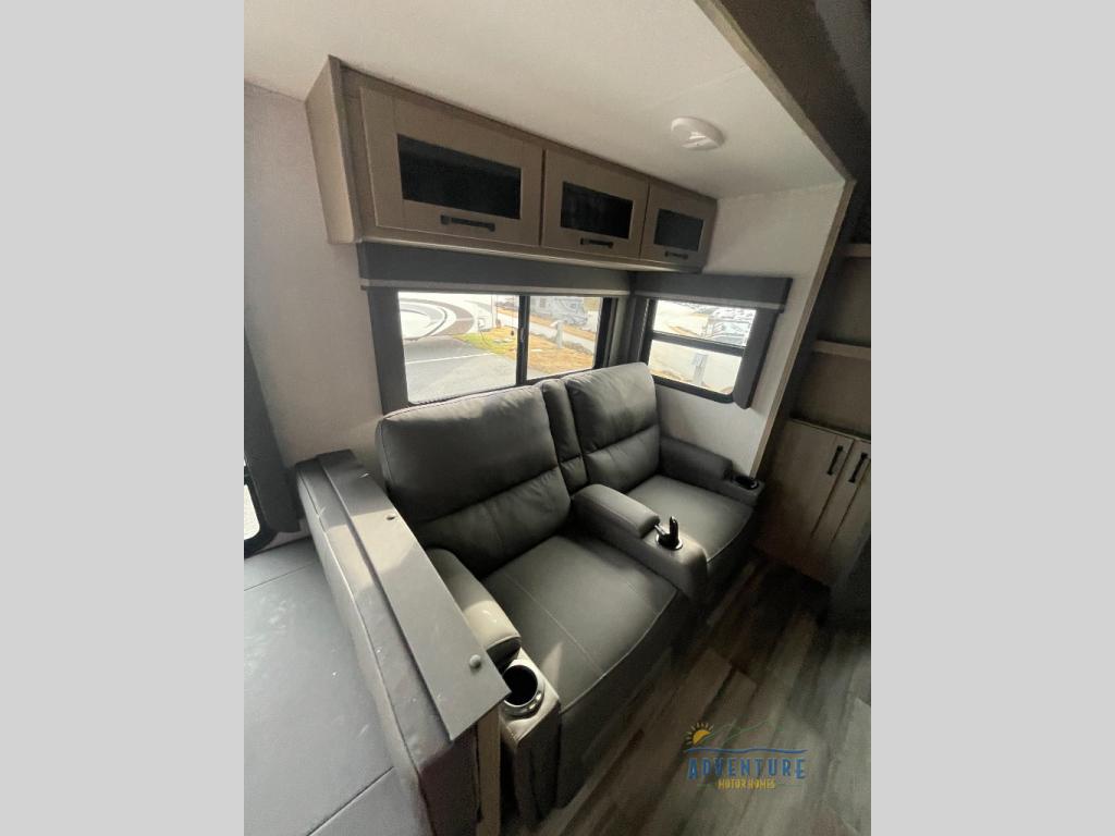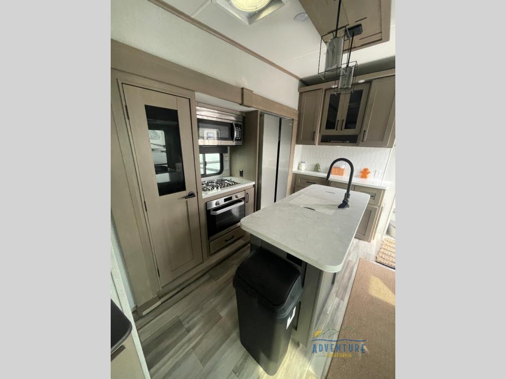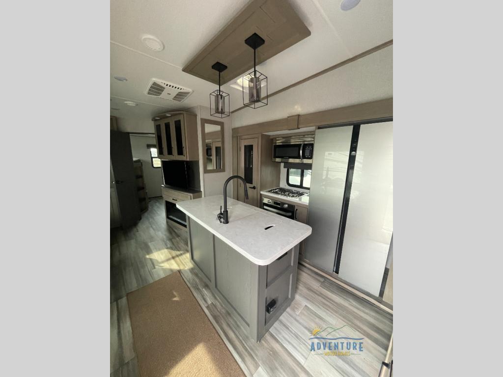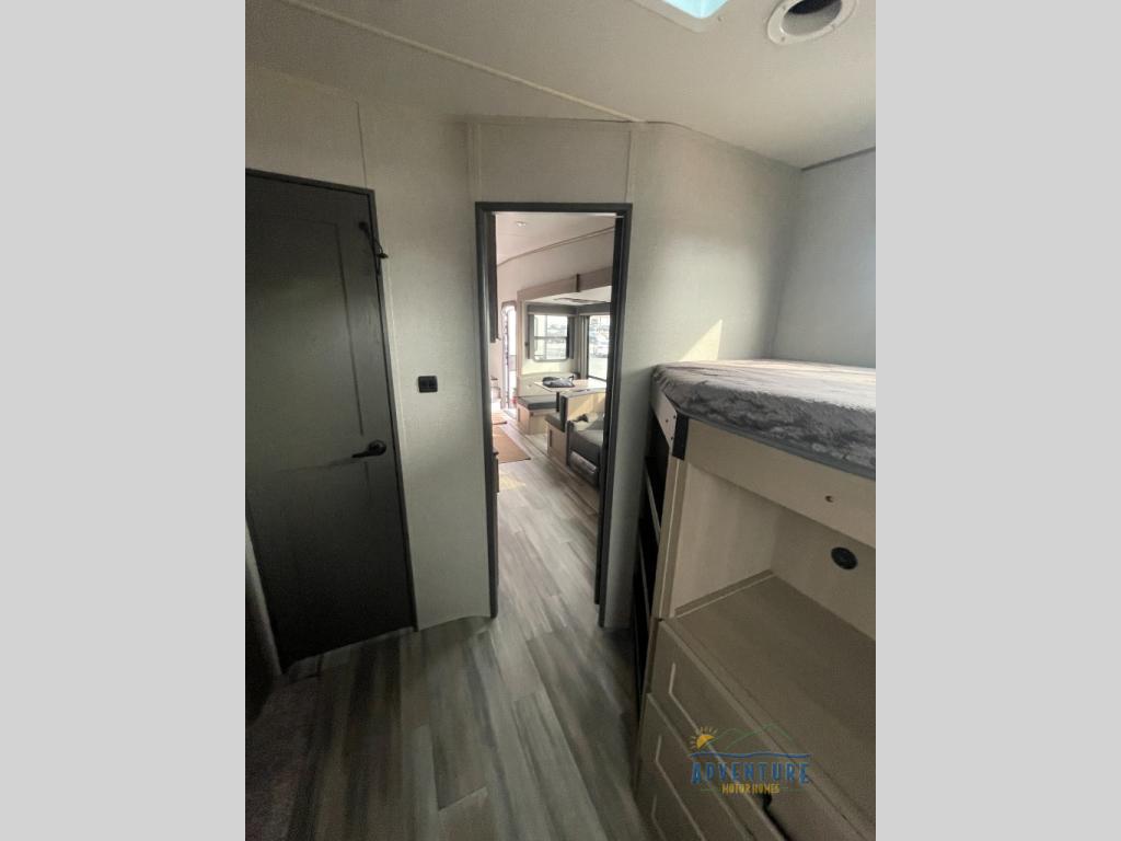 Are you looking to travel with your family and friends and want enough space for everyone to be comfortable? Step inside using the AXIStep, to find a private bunkhouse in the rear of this fifth wheel which offers a slide out flip bunk above a tri-fold sofa, a bunk bed and storage on the opposite side, its very own private half bathroom. The theater seating or tri-fold sofa option is a great place to unwind at night in front of the entertainment center with a 40" LED HDTV and fireplace below it. There is a booth dinette or you can choose a free standing dinette option to dine at, and the kitchen island will provide more counter space to prep meals. You will find full amenities including a 16 cu. ft. 12V refrigerator and a hutch. This fifth wheel also includes a double entry bathroom with a radius shower with a skylight, and you can wake up refreshed each morning after sleeping on your own queen bed.