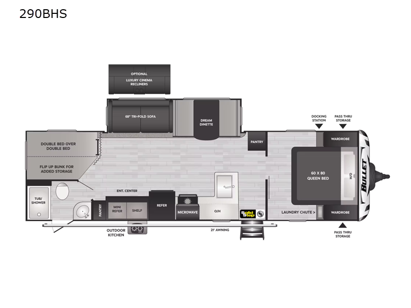With any Keystone Bullet travel trailer you can experience ultra-lightweight camping with style! The interior design and functionality will impress you, and the stunning cabinetry, the vaulted ceilings, and the built-in laundry chute are just a few of the highlights. Each is built with Hyper Deck RV flooring that is stronger, lighter and more resilient than traditional wood laminated flooring, a 51 cu. ft. pass-through storage compartment which provides 25% more storage space and has a 40" wider door meaning easier access and more room for supplies, and a docking station, an easily accessible convenience center with water connections, water heater bypass, KeyTV hookups, stabilizer jack switches and winterization access. You will also find a Giggy box, a weather protected, labeled, and fused electric box, plus more Keystone Exclusives. Start your glamorous and carefree trip today in a Bullet!