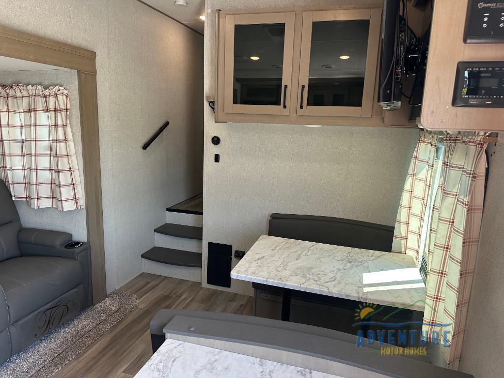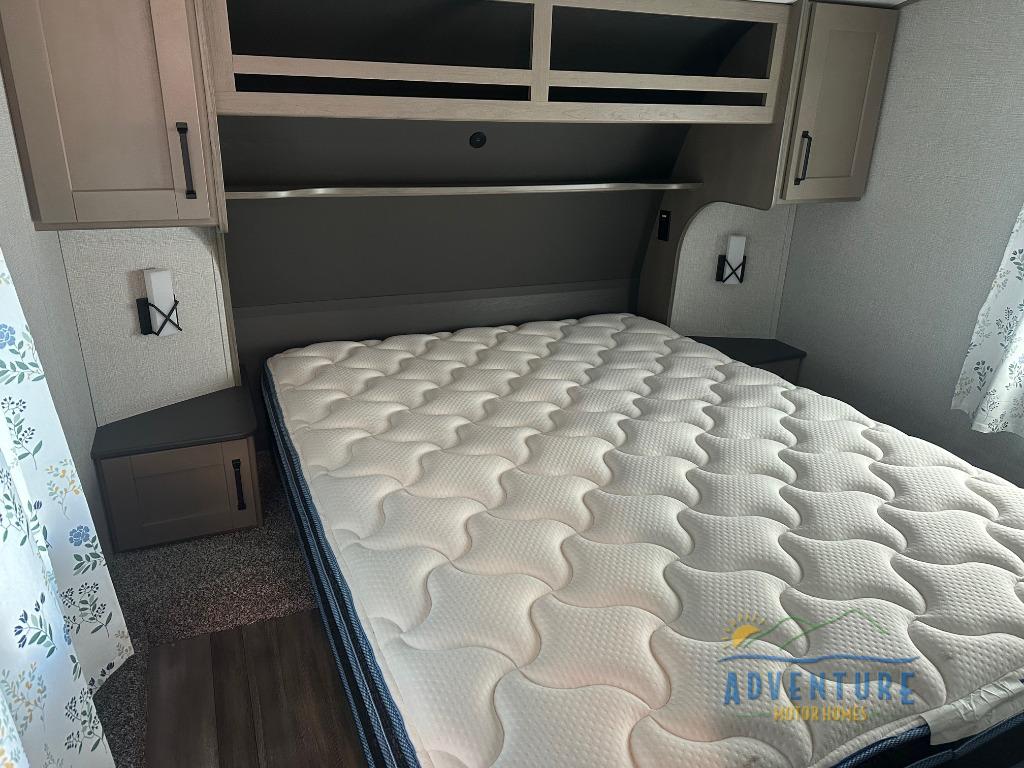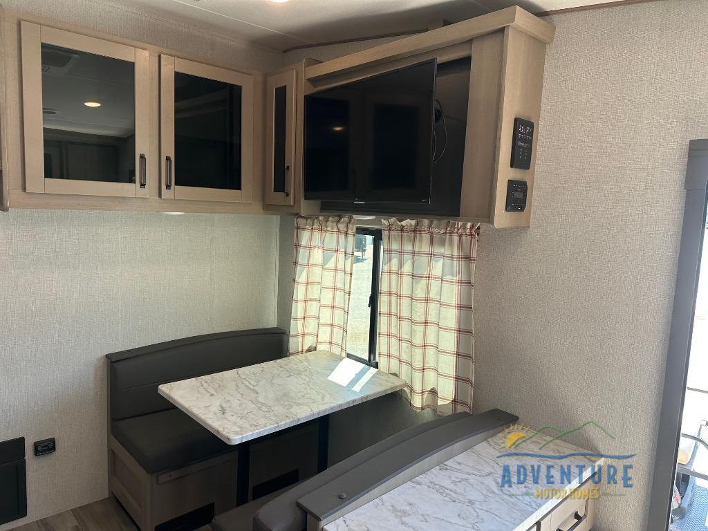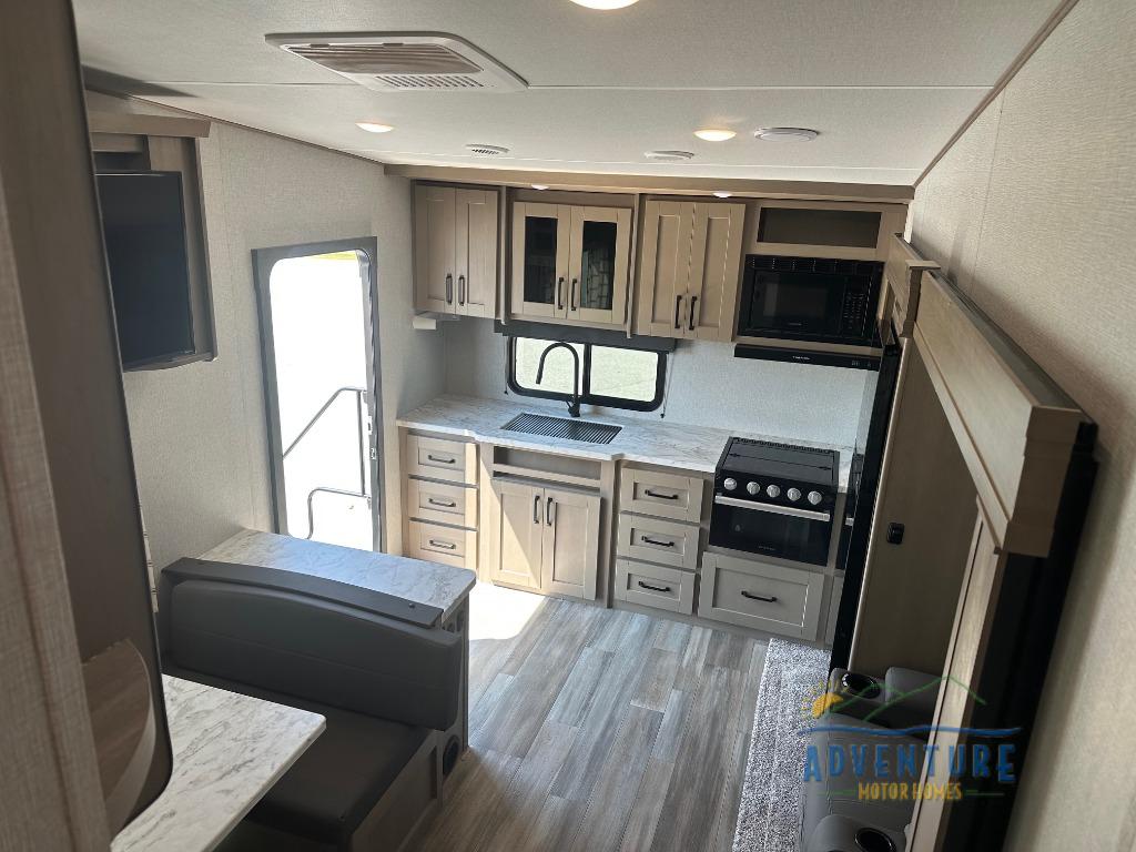 This rear kitchen fifth wheel is sure to meet all of your camping needs! Since the exterior length is only 26' 11", you can easily maneuver in and out of campgrounds. The rear kitchen includes ample counter space to prep meals, a three burner cooktop, and overhead storage for all your necessities. There is a 10 cu. ft. 12V refrigerator within the slide out that also includes the theater seating, and the booth dinette provides a place to dine or play a card game. You will appreciate having convenient storage by the entry door, along with pull-out pet bowls, a functional wardrobe closet in the bedroom and an exterior pass-thru for belongings and camping gear. When you're ready to turn in for the night, the queen bed is sure to bring a great night's rest, while your guests sleep on the booth dinette or optional tri-fold sofa if you replace the theater seating!