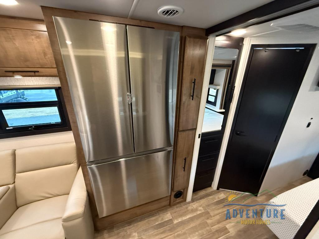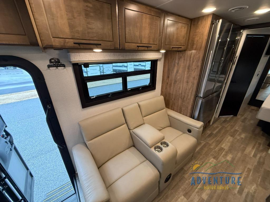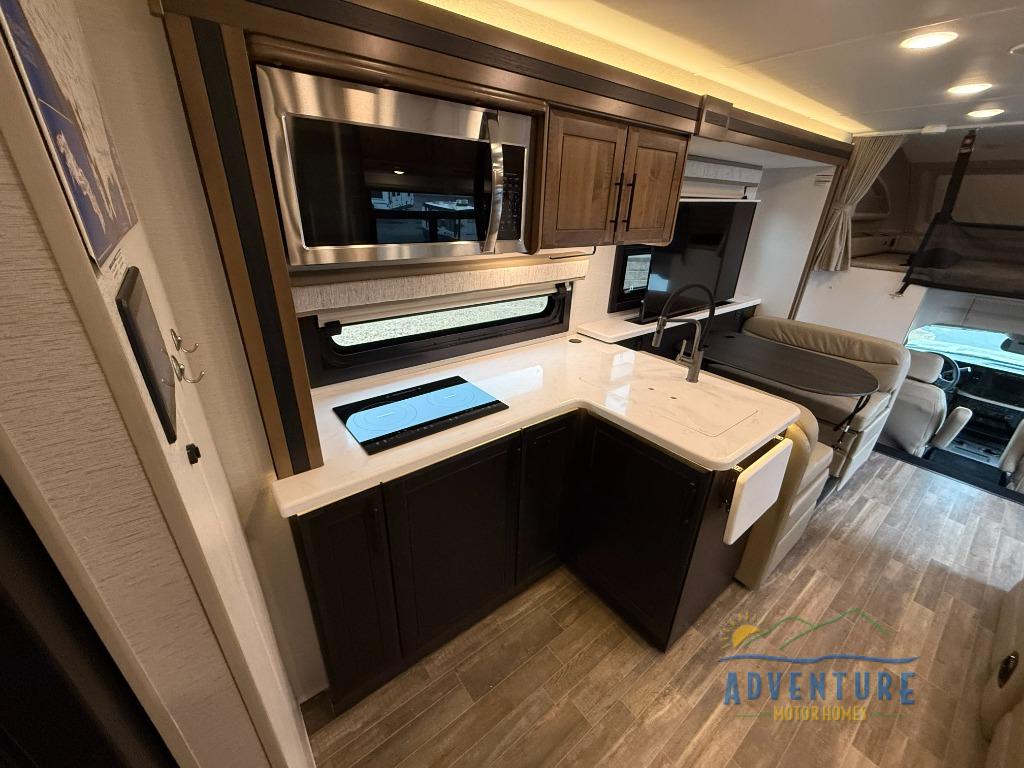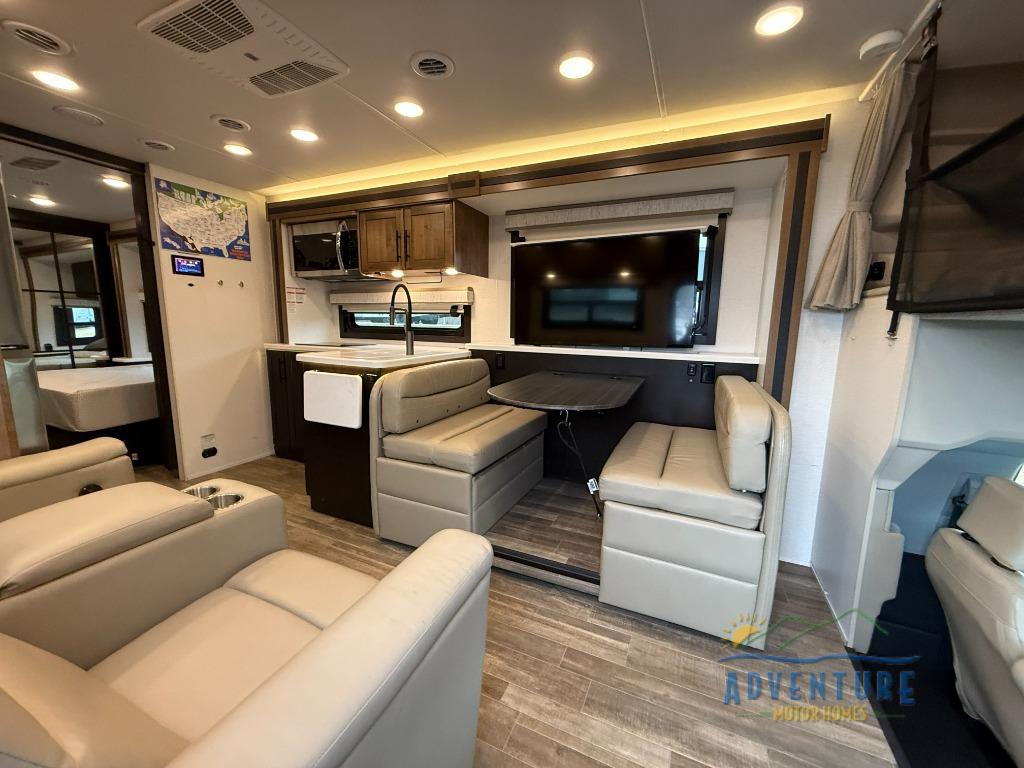 Travel to any destination in comfort with this motorhome! You will have your own place to sleep in the private bedroom with a king bed slide, two wardrobes, and access to the rear corner bathroom which has a 30" x 36" shower. There are more sleeping spaces throughout between the cabover bunk, the 68" jackknife sofa, and the 38" x 70" booth dinette can even transform into an extra sleeping space. Above the dinette is a 50" TV lift and for even more entertainment there is an outside entertainment center with speakers, a LED HD Smart TV, and Bluetooth receiver underneath the 20' awning.