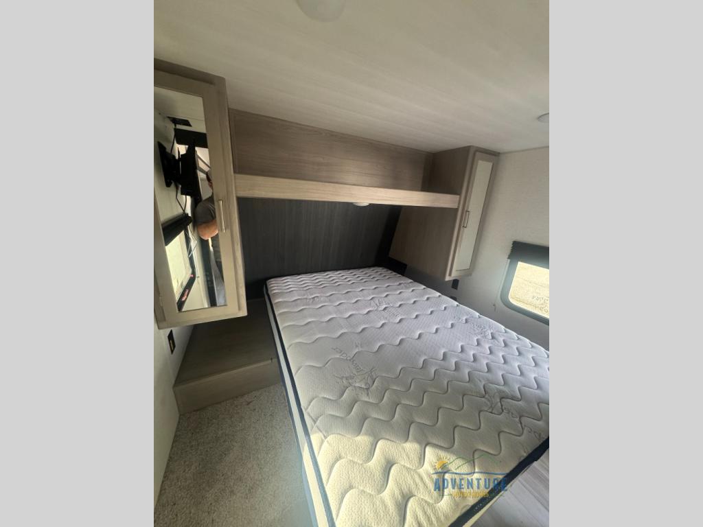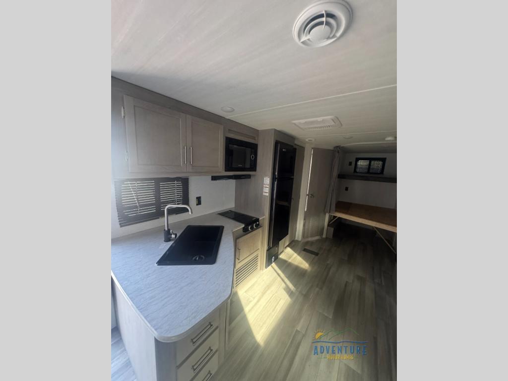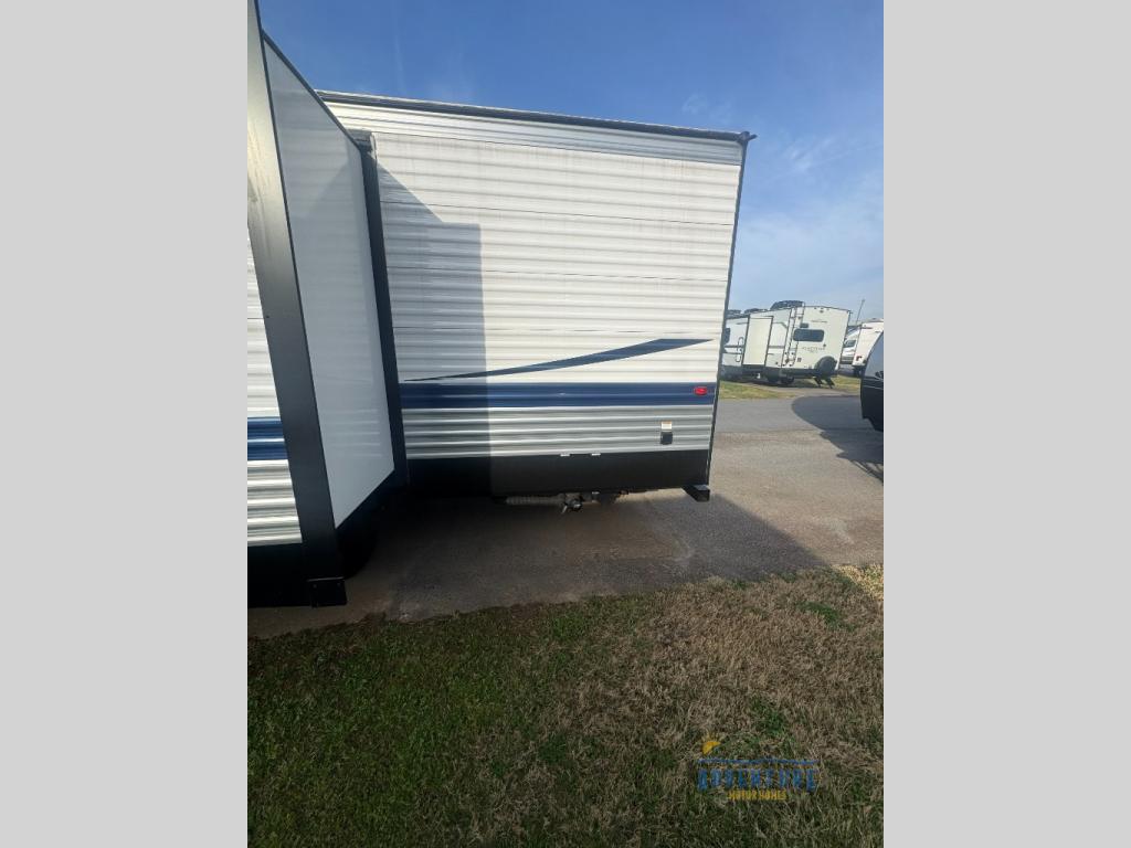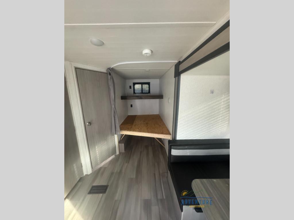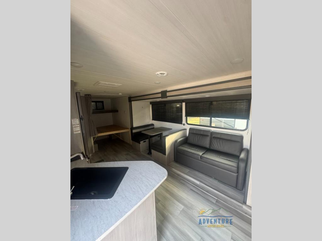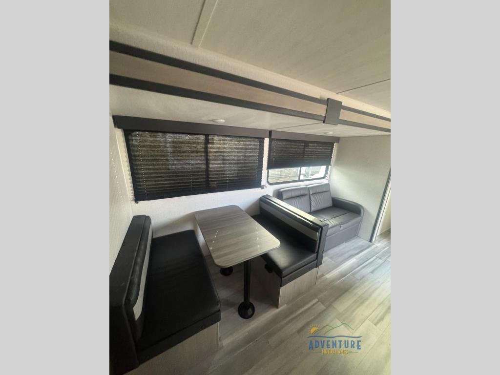You'll have additional space to stretch out in this travel trailer for eight to ten! Within the super slide you'll find the booth dinette and sofa that will be perfect for meal times, relaxing, and sleeping more guests, and there is an entertainment with TV prep for movie nights. The little ones will love the double-size bunks, and the full bath is close by for easy nighttime use. You'll have the front private bedroom with a queen bed all to yourselves, plus there are dual closets and nightstands for your things. This model also includes an exterior pass-through storage outside and a 16' power awning for protection against the sun!