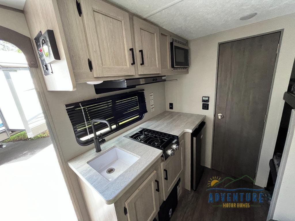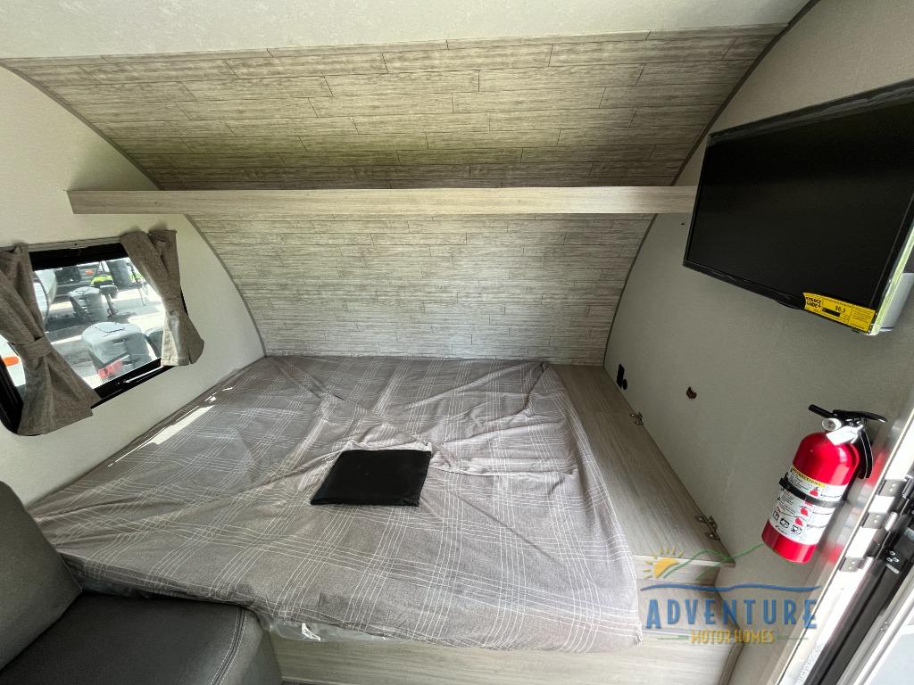 This cozy travel trailer can sleep five, so pack up and head out! You will have a queen bed up front to sleep on each night instead of an air mattress, and the little ones can take the 28" x 70" bunk beds! There is also a 60" sofa here that can sleep an additional guest and is perfect for relaxing during the day. The two burner cooktop and microwave oven means you won't have to cook over a campfire, and the private toilet and shower lets you clean up after a day outdoors. This model includes plenty of storage space, including bedroom storage, an exterior pass-through, plus additional outside storage beneath the bunks for hiking gear!