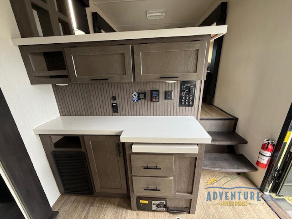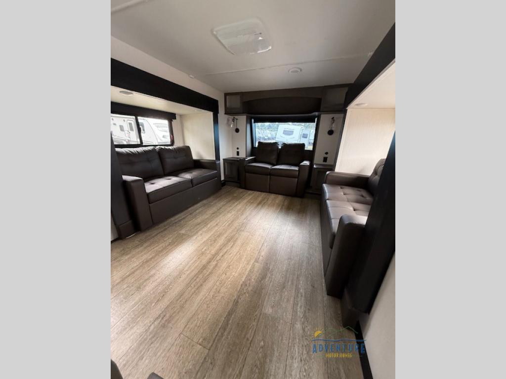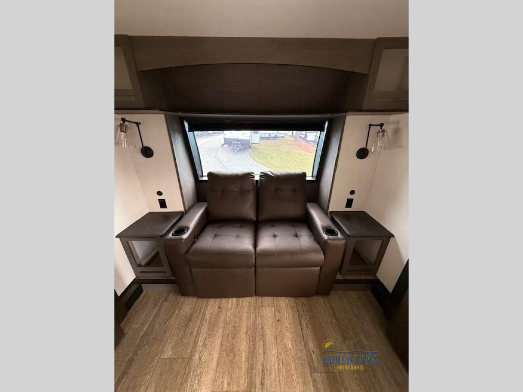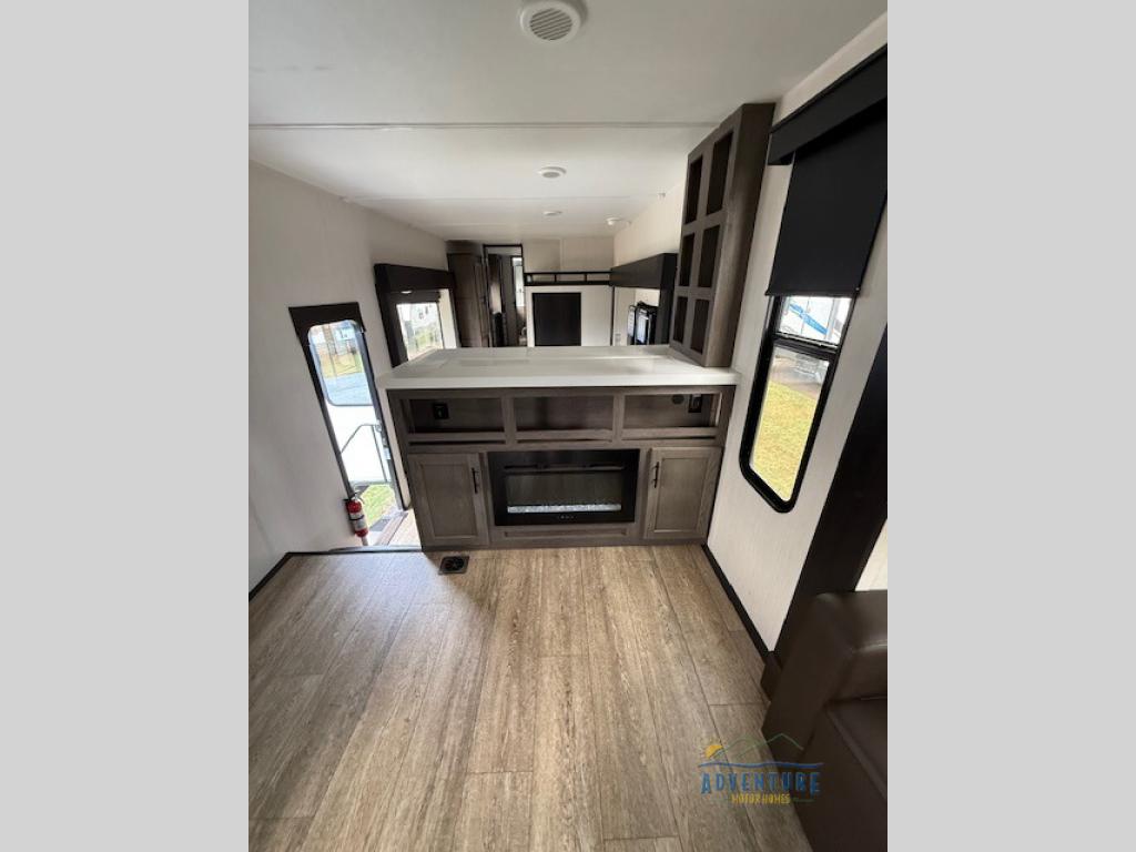 Five slides, a bath and a half, plus sleeping space for six make this fifth wheel the perfect choice! Once you arrive at your destination, prepare lunch on the exterior kitchen. Inside, you'll find a kitchen island, plenty of storage space, plus a free-standing table with chairs and a storage ottoman seat. The front living area will be a favorite place to hang out and this room can double as a bedroom with the two tri-fold sofas. There is also theater seating across from the entertainment center and fireplace, plus storage cabinets for movies or board games. When you're ready to call it a night, head to the master bedroom for a great night's rest on the king bed slide out. You will also love the full rear bath with dual sinks, a spacious shower, plus a closet with stackable washer and dryer prep!