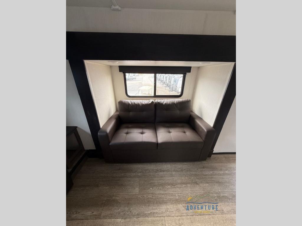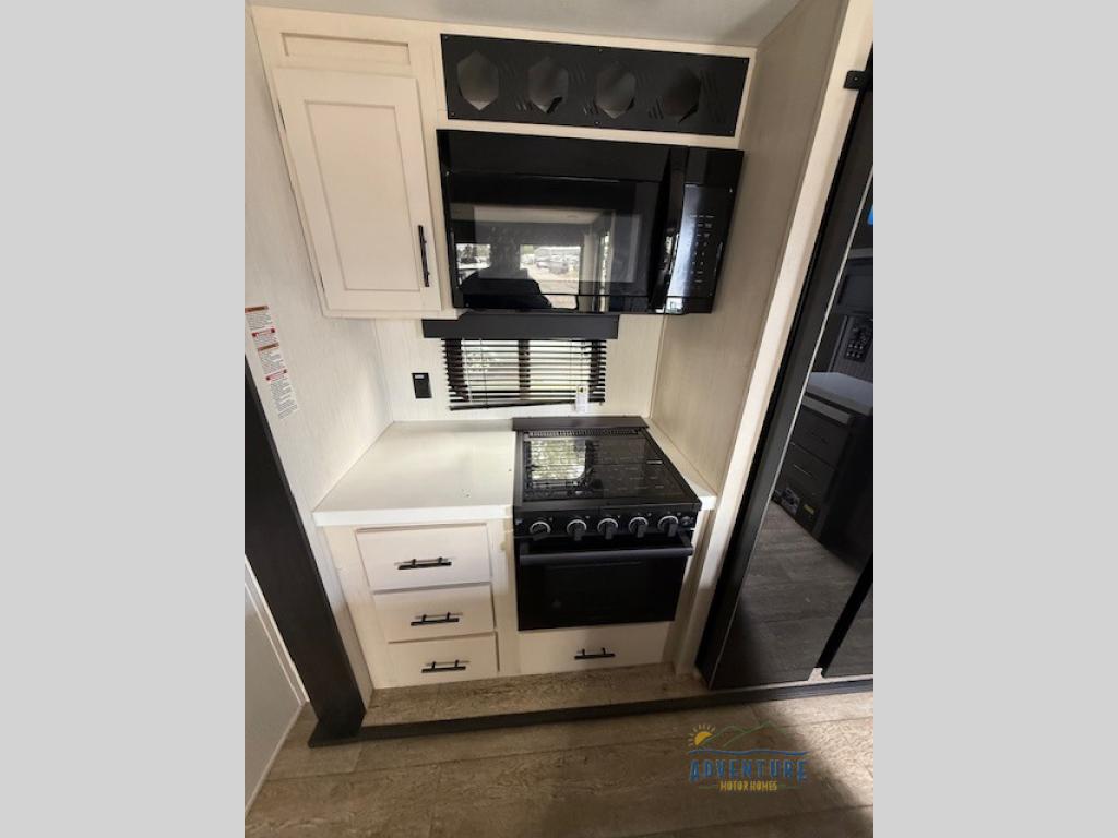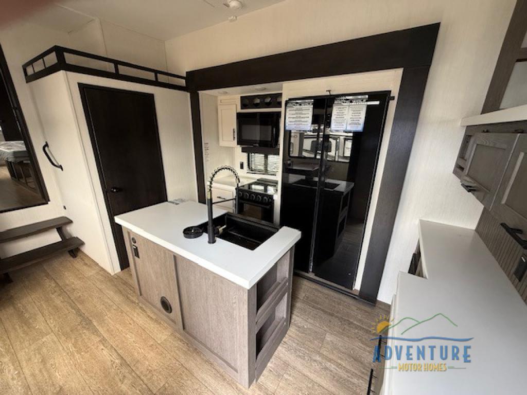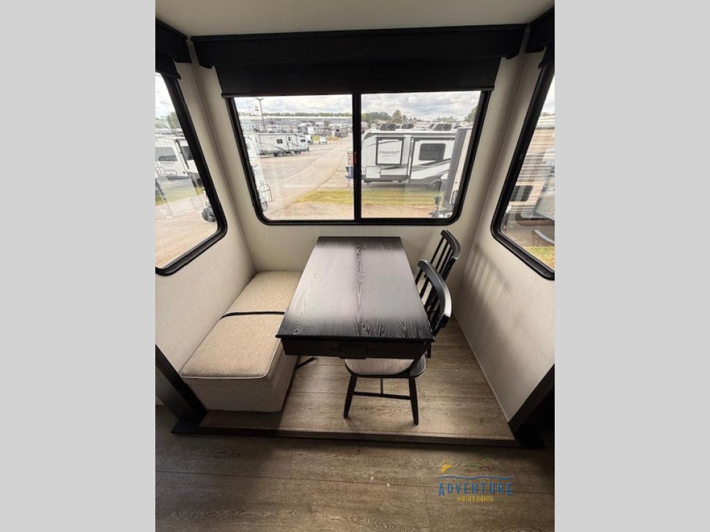 Five slides, a bath and a half, plus sleeping space for six make this fifth wheel the perfect choice! Once you arrive at your destination, prepare lunch on the exterior kitchen. Inside, you'll find a kitchen island, plenty of storage space, plus a free-standing table with chairs and a storage ottoman seat. The front living area will be a favorite place to hang out and this room can double as a bedroom with the two tri-fold sofas. There is also theater seating across from the entertainment center and fireplace, plus storage cabinets for movies or board games. When you're ready to call it a night, head to the master bedroom for a great night's rest on the king bed slide out. You will also love the full rear bath with dual sinks, a spacious shower, plus a closet with stackable washer and dryer prep!
